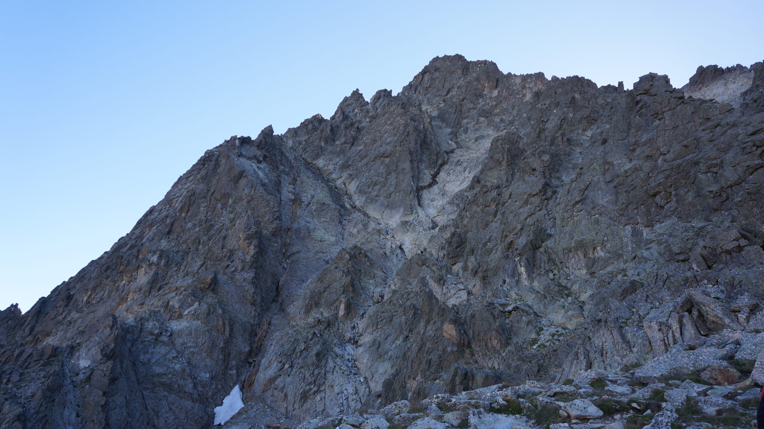 Juste au-dessus du refuge, nous passons la brèche de Carenère après laquelle l’ambiance minérale s’accentue. Eclairé par le lever du soleil, le Palas domine les lieux et notamment les lacs de Batcrabère que nous longeons sur un bon sentier retrouvé après une tentative avortée de raccourci. Au lac supérieur de Batcrabère (2182 m), le sentier file vers le Sud-Ouest jusqu’aux lacs de Micoualou (2302 m). Le Balaïtous et sa face austère prend de plus en plus d’ampleur et nous « observe » dans la partie que j’ai trouve la plus fastidieuse : rejoindre le col Noir. Même si c’est cairné, le terrain n’est pas fameux et devient de plus en plus croulant à l’approche du col qui marque la frontière avec l’Espagne.