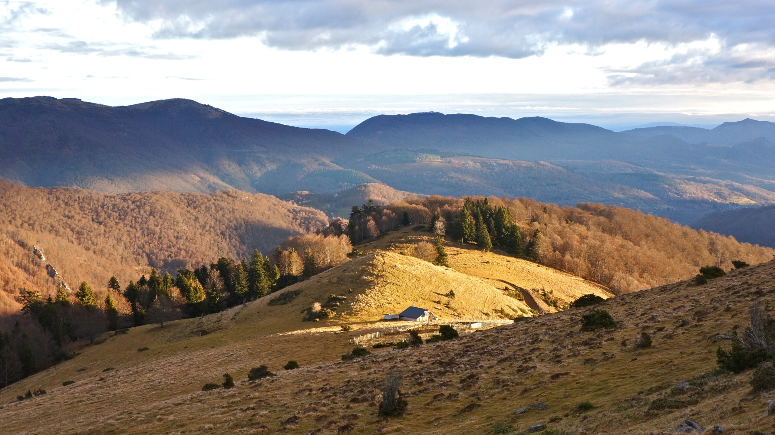 Pour le départ, continuer quelques mètres sur la route puis tourner à gauche sur une route goudronnée qui monte jusqu’à une maison isolée avant de se transformer en piste puis en chemin. Ce dernier monte alors dans la clairière puis passe devant une cabane fermée. Peu après la cabane, nous suivons un très large sentier partant à flanc vers le sud-ouest. Assez rapidement, il finit par se perdre en arrivant dans la forêt. Nous remontons alors la large crête boisée en direction de l’est et des étendues herbeuses s’étirant vers le cap de Gauch. Dans cette remontée, nous croisons deux cerfs majestueux en train de s’écharper à coups de bois.