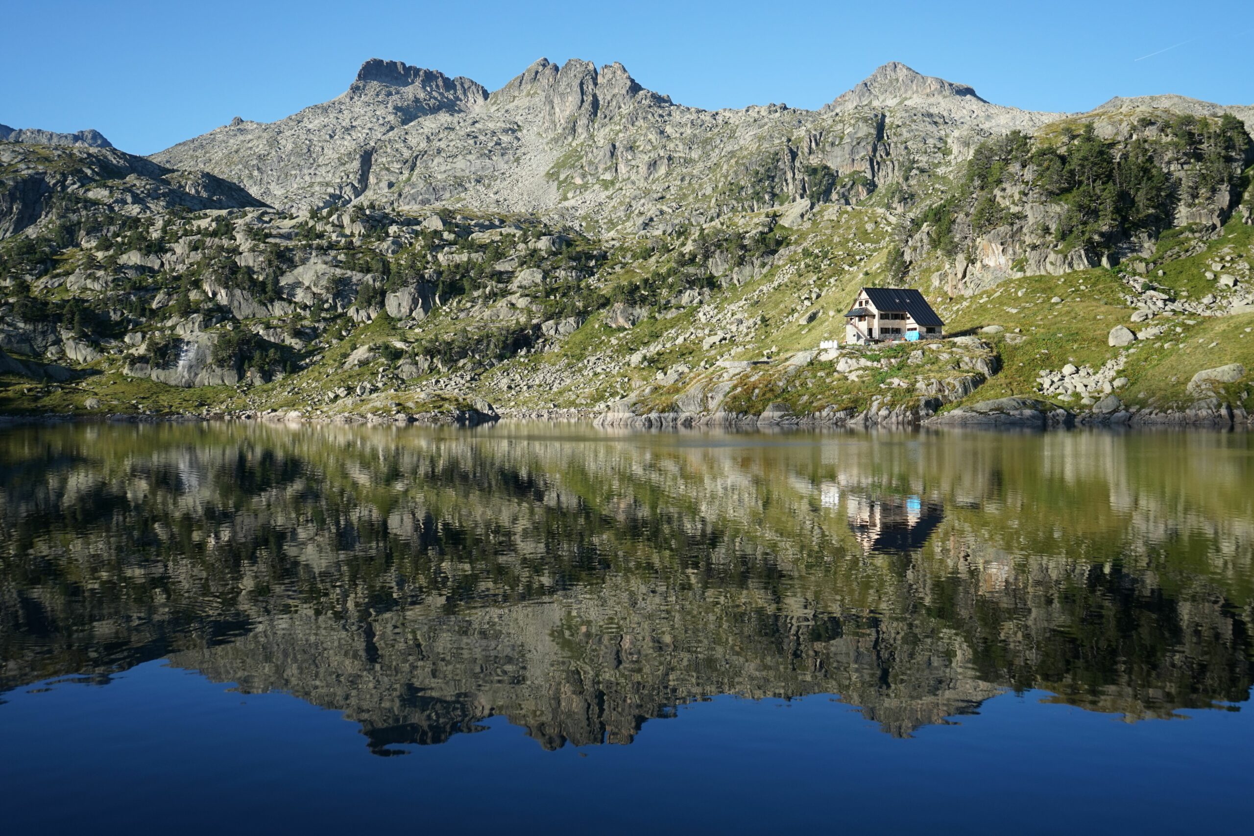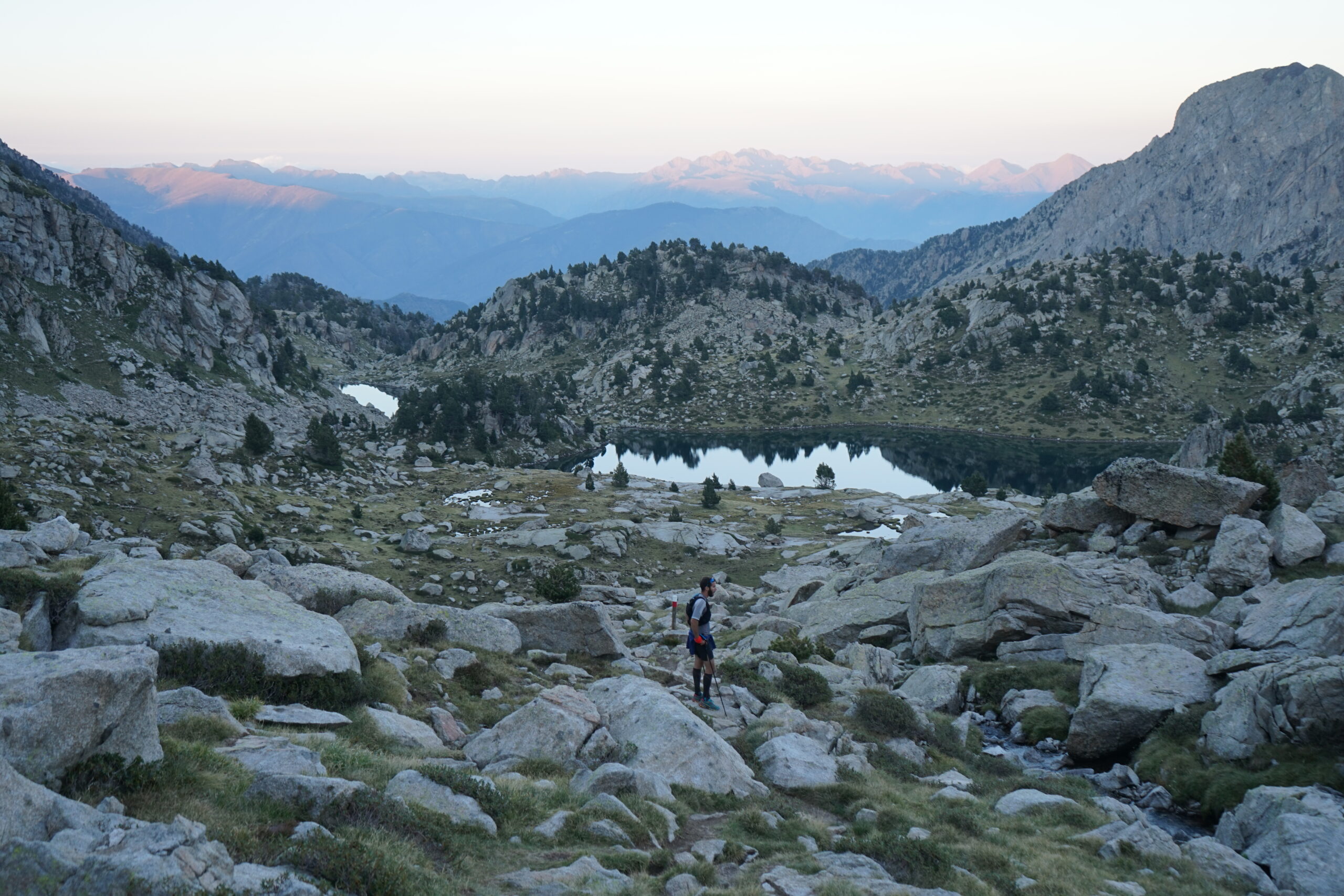 L’itinéraire du refuge d’Amitges (1/9) est bien indiqué. Dans la nuit noire et avec le programme prévu, c’est plaisant de ne pas avoir à hésiter sur la direction à suivre. Toujours bien aménagé, il rejoint ensuite une large piste que nous suivons jusqu’au refuge. Au loin dans les fourrés, nos lampes éclairent deux billes vertes : ce sont les yeux d’un isard probablement peu habitué à voir du monde si tôt. Nous disons au revoir aux larges chemins et pistes roulantes puis quittons le refuge pour monter en direction du port de Ratera (2590 m). Le jour est en train de se lever, permettant de garder le moral au top et remettre d’aplomb Mathieu qui était dans le dur en tout début de journée. La descente jusqu’au refuge de Saboredo (2/9) est agréable et serpente entre de magnifiques lacs dans lesquels se reflètent certaines cimes qui commencent à s’embraser. Nous avons déjà passé une dizaine d’étangs alors que nous marchons depuis 3h à peine. Nous laissons le refuge se réveiller tranquillement, prochain objectif : le refuge de Colomers.