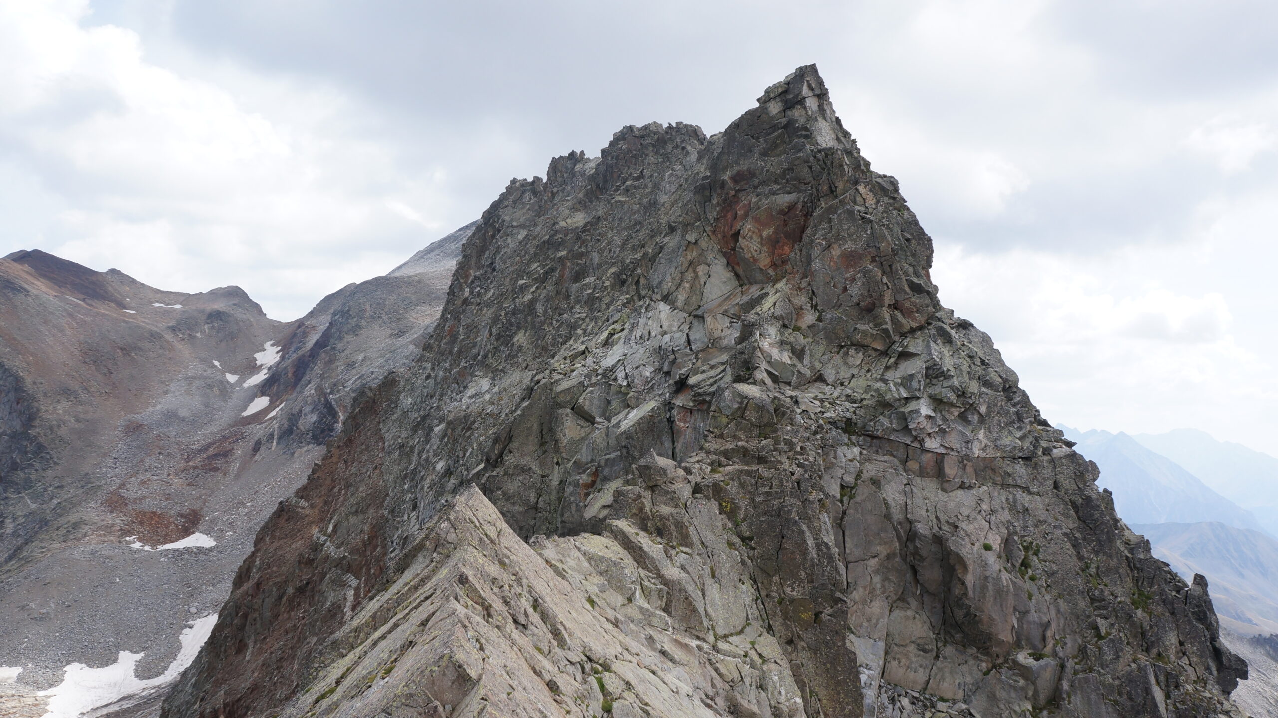Dans un terrain moyen mais facile, nous atteignons le pic du Portillon d’Oô, premier sommet du week-end, où la longue crête s’étire jusqu’au cap de Seil de la Baque. À partir de là, c’est de la crapahute en bon rocher dans un cadre extraordinaire. Quelques traversées/escalades/désescalades ici et là en II+ max parfois aériennes mais sans plus, jusqu’à venir buter sur une brèche.