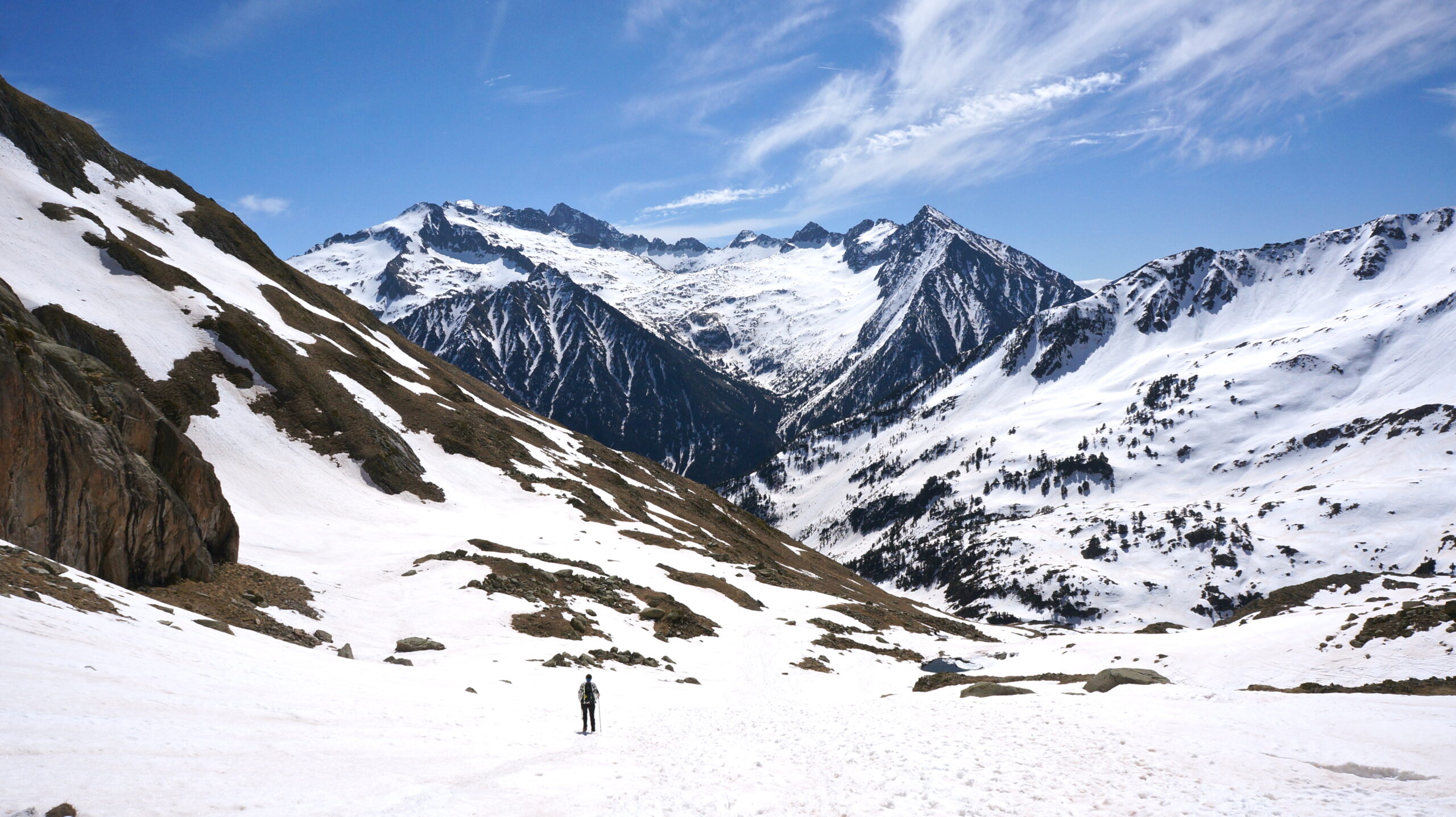 Sauf un ressaut plus raide à la fin, le vallon de Remuñe monte régulièrement. Nous y trouvons la neige vers 2100 m d’altitude au niveau où les murailles commencent à se dresser. Issues du mail Pintrat d’un côté et de la tuca de Lliterola de l’autre, elles protègent le fond du vallon et l’enneigement doit persister tard dans la saison. Après être passés à proximité des lacs de Remuñe (2266 m), il est préférable de quitter le fond du vallon et rester à flanc rive droite. Poursuivre en ascendance jusqu’à venir buter sur un ressaut plus raide. Heureusement, les traces déjà présentes nous aident bien. La pente s’adoucit progressivement jusqu’au large portal (col) de Remuñe (2824 m). L’ibón blanco de Lliterola ainsi que l’ensemble Perdiguère-Crabioules se dévoilent majestueusement. Pour atteindre le sommet, passer à l’ouest de la Forca de Remuñe (côté Luchonnais) et rejoindre la petite crête SO cairnée et facile mais en rocher moyen. Au sommet, belle vue sur les cimes environnantes jusqu’au massif de l’Aneto. La muraille S du Maupas est impressionnante tout comme le secteur Boum-Planet.