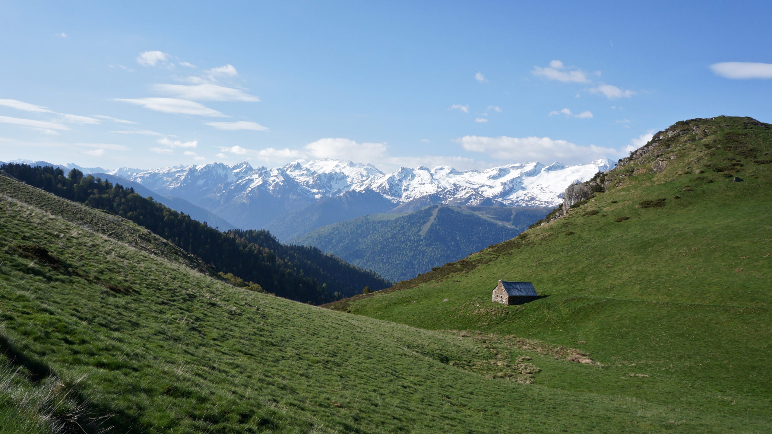 Du village de Saccourvielle, le chemin balisé rejoint la crête près du Cap de la pène. Dans les bois, nous rencontrons deux biches et la vue s’ouvre progressivement sur la haute-montagne enneigée. Le chemin oscille ensuite de manière agréable, en passant près de deux jolies cabanes (Cabane de Courrau et l’autre non annotée sur la carte). Une dernière montée permet de rejoindre le Sommet d’Antenac (1990 m) qui jouit d’un panorama admirable. Le but était de démarrer par la plus grosse montée (1000 mètres de dénivelé) pour être tranquille.