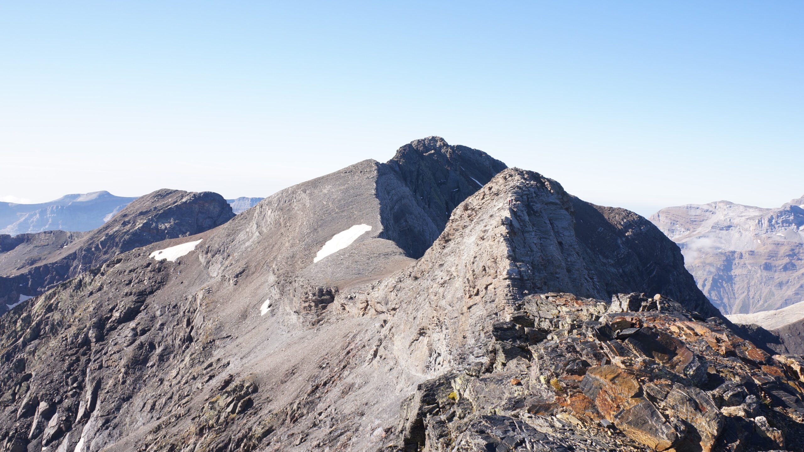 Du pic de Troumouse, s’approcher facilement du pic de Serre-Mourène (3090 m), le « crux » de la journée où deux personnes sont d’ailleurs en train de faire un rappel pour en descendre. Au pied du mur, ça a l’air de très bien passer et nous nous engageons sans difficultés jusqu’en haut : les prises sont bonnes et nombreuses. Le contraste du Serre-Mourène est amusant: le côté Nord est un petit mur d’escalade tandis le côté Sud est une douce pente d’éboulis. C’est ensuite de la marche jusqu’à la Petite Munia (3096 m) puis jusqu’à la Munia (3133 m). Depuis le temps qu’on en parlait de ce sommet … Belles vues sur le massif de Gavarnie, la crête que nous venons de parcourir, et l’imposant Pic de Campbieil.