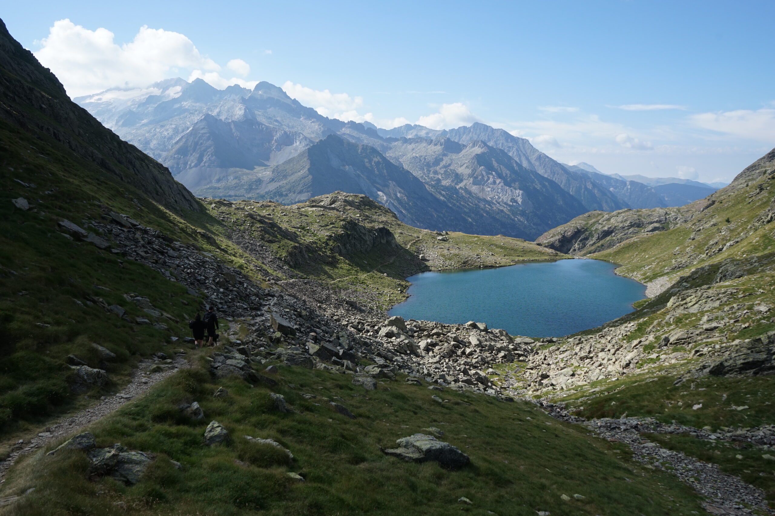Semaine du 15 août, semaine de rush dans les hauts lieux pyrénéens. Le parking de l’Hospice de France est déjà bondé à 8h30 mais notre itinéraire devrait nous éloigner un peu des foules. Le chemin de l’Impératrice est faussement plat. Après cinq kilomètres nous arrivons dans le cirque de la Glère, encore calme, puis poursuivons vers le port de la Glère (2367 m). Le chemin est assez rude sur les 250 derniers mètres de dénivelé. Ce col frontalier semble être une randonnée courue pour nos amis ibériques avec le magnifique ibón de Gorgutes en dessous et le massif de la Maladeta au loin. Un vent frais nous accueille, que dis-je, nous chasse vers l’étang. Nous passons par le déversoir où le sommet se montre enfin puis montons au plus facile dans le gispet pour prendre pied dans le vaste vallon suspendu où les cailloux finissent par gagner la partie. Bien plus étroit que ce à quoi je m’attendais, le port Vieil (2635 m) s’atteint par une pente raide d’éboulis. Les jambes sont assez lourdes après quelques cols à vélo la veille.