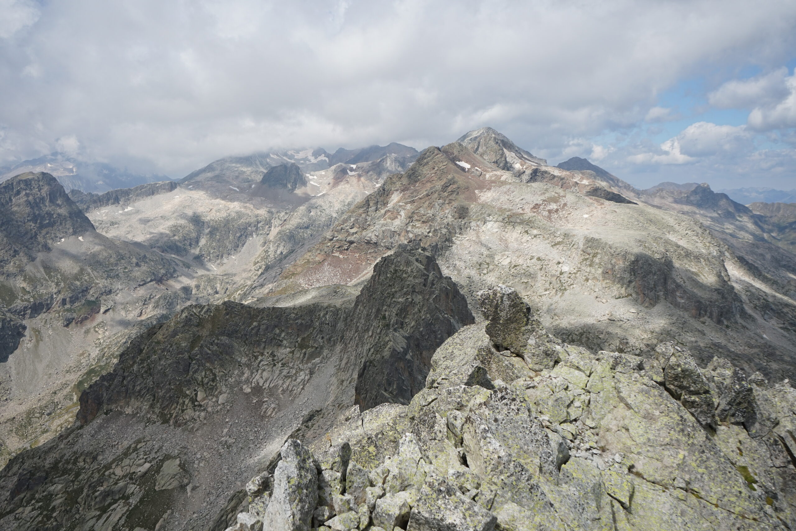 Depuis le col, la crête jusqu’à la mail Pintrat oppose quelques difficultés. Nous passons facilement un premier ressaut puis une portion horizontale escarpée mais aisée. Le ressaut suivant est ensuite plus compliquée : nous restons versant Lys pour nous élever de gradin en gradin (II+ max.) dans du rocher plutôt fiable. Nous guidons et encadrons Seb’ dans ces petits passages grimpants puis rencontrons un petit cairn et une sangle de rappel. À cet instant, nous avons vu après coup qu’il aurait été possible de poursuivre à flanc versant Lys pour remonter ensuite vers le pierrier sommital. Au lieu de ça, nous rejoignons le fil de la crête par un passage exposé (III) après lequel les difficultés cessent. Aussi appelé pic de Port Vieil ou tuca del Puerto Viello de Gorgutes par les espagnols, le sommet est un somptueux mirador sur la haute vallée de Benasque. le pic de Sauvegarde est impressionnant de sévérité alors qu’il est facilement accessible depuis le port de Vénasque. Partiellement accrochés par de sombres nuages élevés, les massifs des Posets et du Perdiguère font austères. D’ailleurs, la pluie semble de plus en plus proche et nous quittons le sommet.