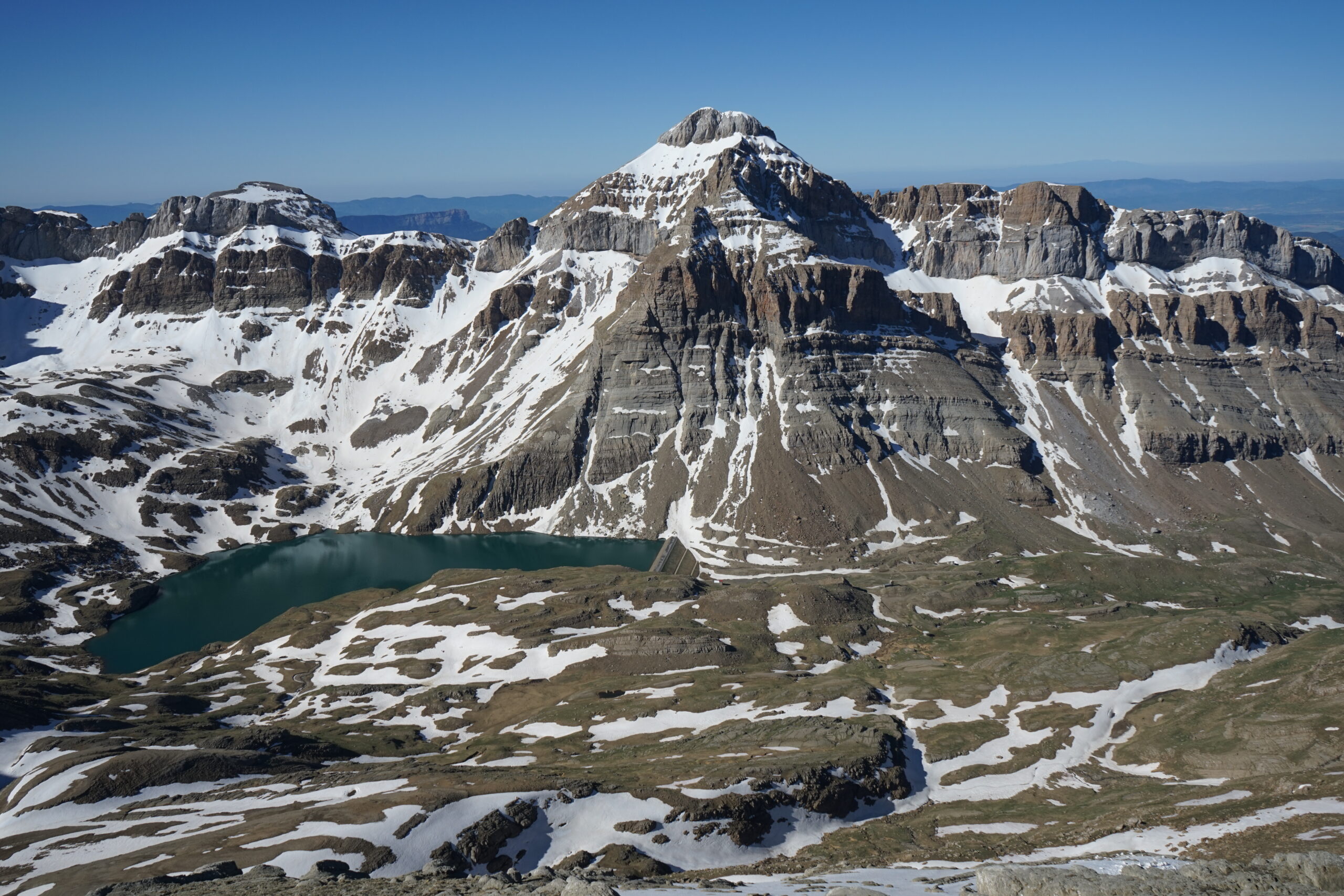 La montée à la Pala de Ip se fait par une trace cairnée qui enroule sa face SE avant de repartir vers le N-NE. Je parviens à éviter aisément le dernier névé qui me laissait perplexe de loin et continue sur la crête facile jusqu’au point haut. La Collarada en jette : une véritable cathédrale d’une grande complexité. De retour au col (2622 m) au pied du sommet, je descends dans le couloir plein S., déneigé dans sa partie la plus raide, en direction de l’ibón de Ip. Dès que la pente s’adoucit, je pars à flanc vers l’O pour rejoindre la piste sans trop perdre d’altitude. Le terrain étant parfois assez chaotique, pas sûr que ce choix fut le bon, mais j’y ai surpris des isards à quelques mètres. La piste détériorée n’est absolument plus carrossable et se résume à un long faux-plat montant où je chéris les portions ombragées. Ne reste plus qu’à avaler les dizaines et dizaines de lacets où on peut apercevoir la gare de Canfranc qui ne se rapproche décidément pas assez vite.
