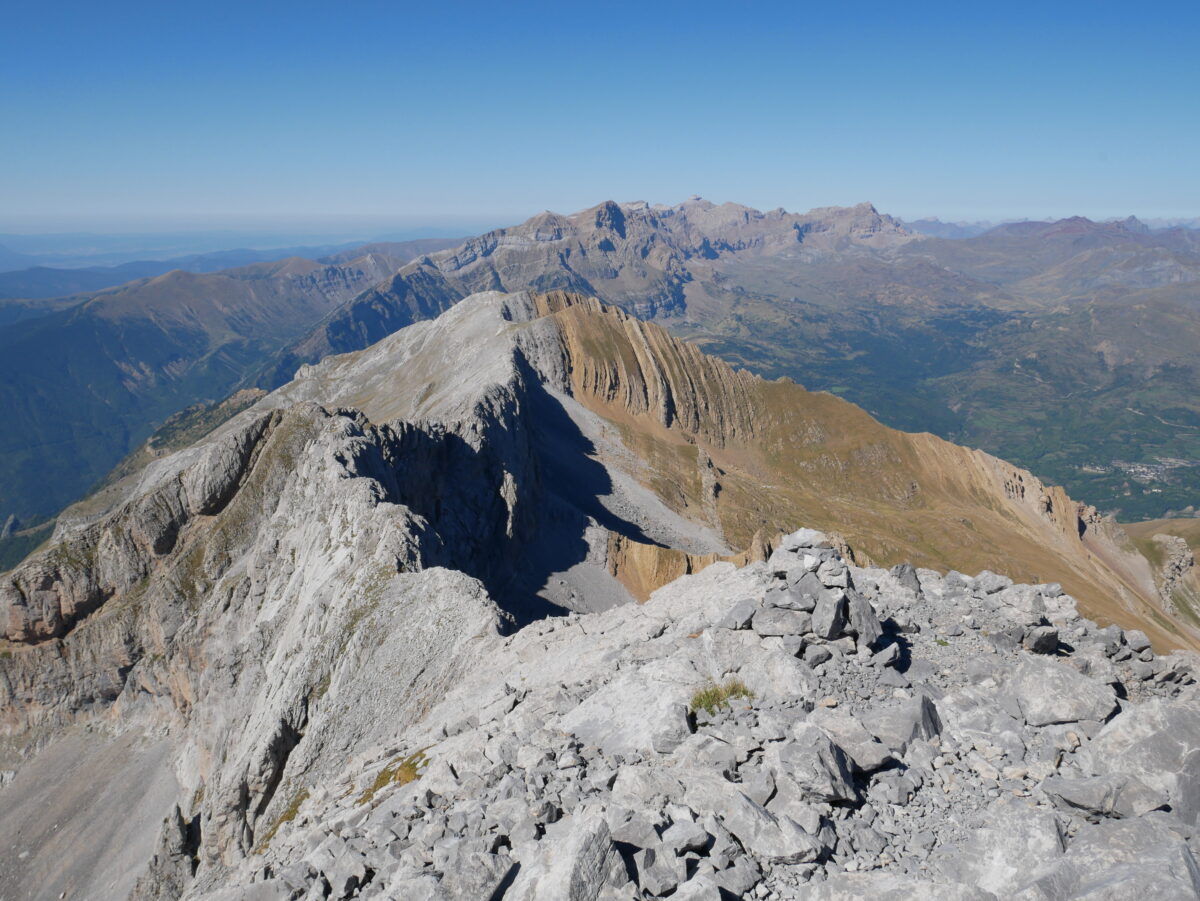 Au premier plan, la crête parcourue vue depuis la peña Sabocos. Au loin, sierra de Partacua et Collarada