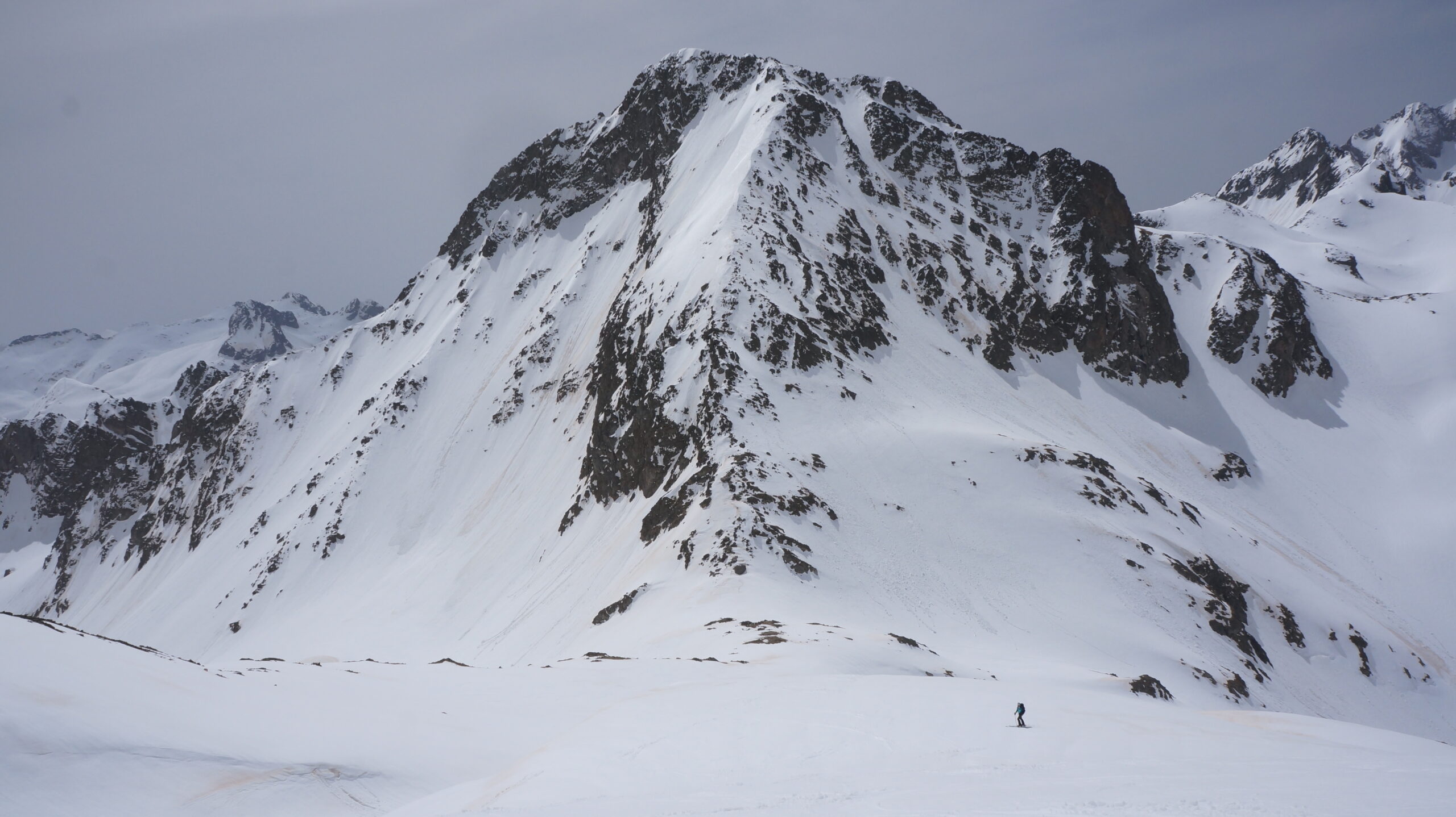 De retour sur les skis, nous rejoignons l’entonnoir sous la pène d’Aragon pour une descente mémorable face à la grande Fache sur une neige excellente. Mince, nous sommes déjà au col de la Fache, j’aurais aimé que ça dure des heures. Pour la suite, l’exposition et l’altitude ont changé et la neige devient bien plus physique à skier : très lourde et toujours ses zones orangées sablées qui freinent la progression. Une fois en face du refuge, il est possible et judicieux de rester rive droite pour continuer à descendre pour rejoindre ensuite la voie normale de descente en traversant le torrent plus bas. Je ne l’ai compris qu’après et nous pouvons donc dire au revoir aux sympathiques gardiens avant de poursuivre en direction du pont d’Espagne. Alors oui, comme dirait un des gardiens, c’est toujours mieux que le périph’, mais c’est pas le plus cool !