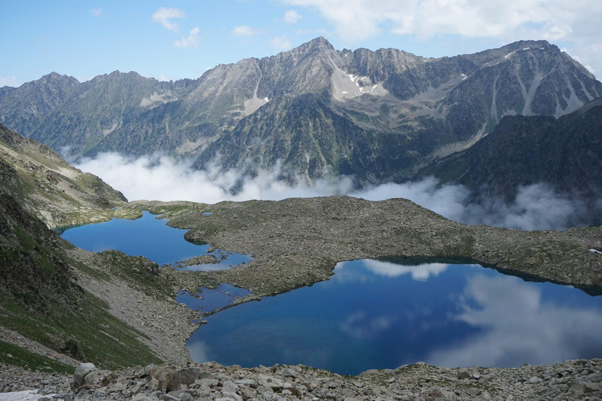 La descente du pic d’Estibe Aute vers le col homonyme (2622 m) n’est pas si simple. Elle demande un peu d’attention au début : une cheminée raide sous le sommet puis un contournement un peu exposé de l’antécime après laquelle le terrain s’assagit tout doucement. L’horloge a tourné et je fais le deuil d’une tentative au Grand Pic des Paloumères. Je fais un autre deuil : celui d’une descente tranquille et roulante. C’est d’abord un pierrier pénible pour rejoindre les lacs. D’ailleurs, pour profiter au mieux du potentiel des lacs d’Estibe Aute, il ne faut pas hésiter à prendre un peu de hauteur car ils sont bien plus jolis que lorsqu’on les observe depuis les rives. Ensuite, le chemin qui descend dans la vallée d’Estom est très rude : 750 mètres de D- pour bien peu de distance. Après ce broyage en règle des quadriceps, je retrouve la vallée d’Estom puis le parking ultra bondé de la Fruitière. C’était mieux au pic Henri Pont.