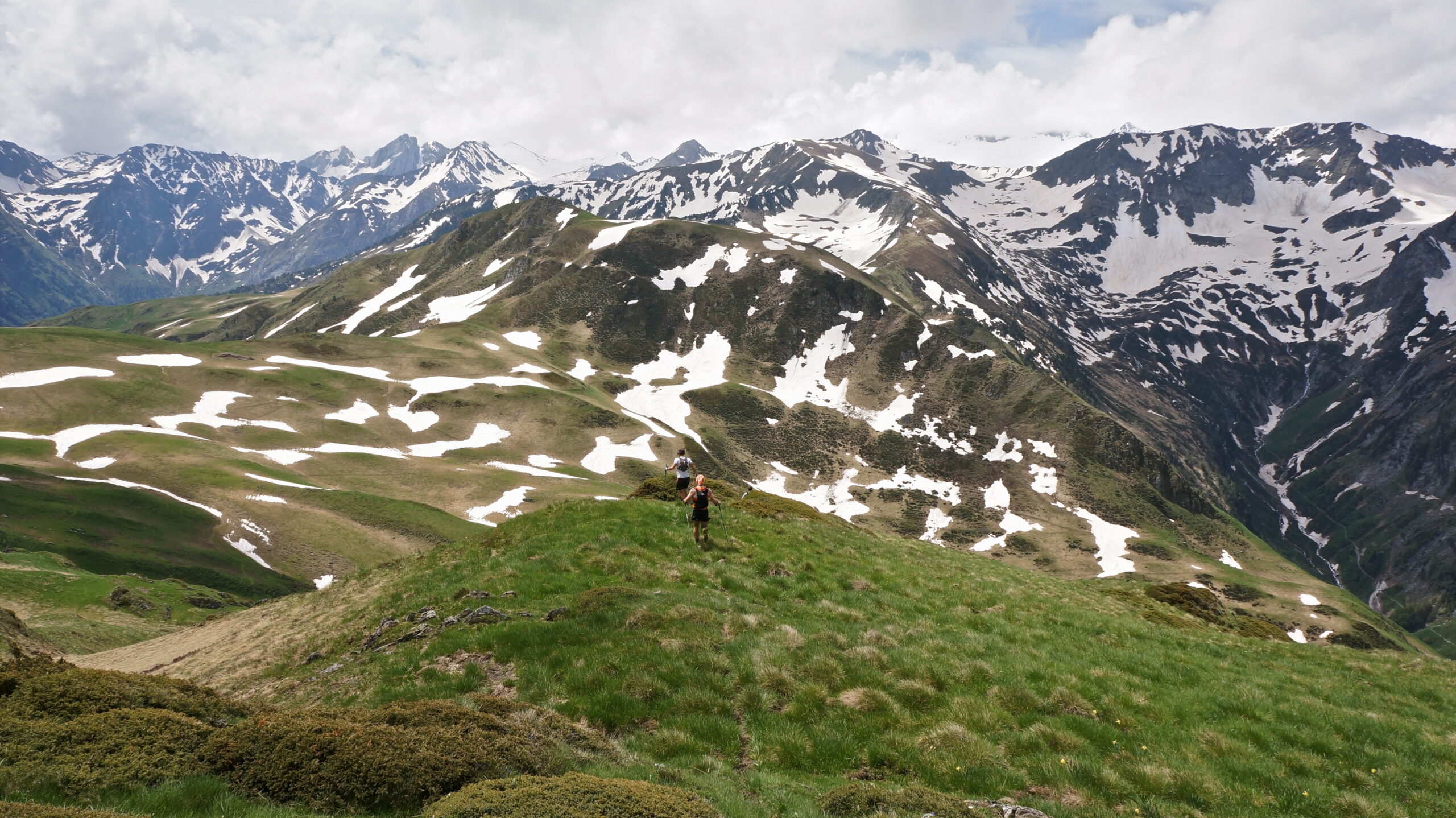 Elle oscille en passant par le pic d’Arrès (2162 m), le mont de Montagou (2151 m) puis le pic de Campsaure (2141 m). Quelques bornes frontières plus tard, nous entamons une pente plus sévère jusqu’au pic de Pouylané (ou Roumingau, 2219 m). Météo agréable et jolis paysages de fin de printemps, le groupe est enchanté. Je réfléchis à continuer par les crêtes jusqu’au pas de l’Escalette mais nous descendons finalement sur le grand plateau herbeux pour rejoindre le chemin menant à l’Hospice de France. Après une boisson rafraîchissante, le reste du groupe rentre à Ravi par le chemin normal. Avec Julien, pour rallonger un peu la sortie et parfaire l’entraînement pour le GR20, nous entreprenons un large détour pour rentrer.
