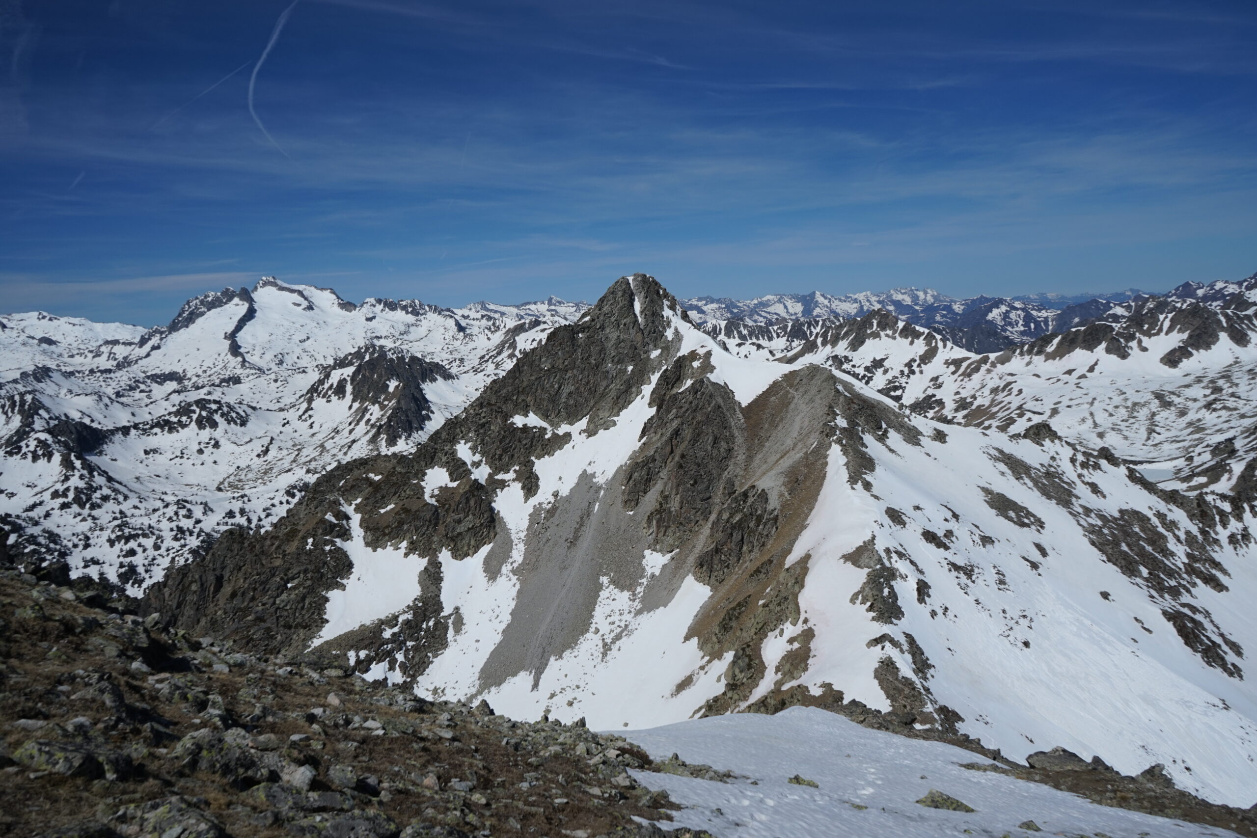Passage rapide par le portarras, déjà connu, puis descente entièrement sèche jusqu’au col de Bastanet (2509 m). Montée sans problème en direction du pic de Bastan jusque sous le sommet où je dois mettre les crampons pour assurer le coup sur un passage enneigé après lequel je rejoins la vire d’été amenant facilement au sommet. Très beau panorama printanier. Descente par le même itinéraire : je rechausse les crampons pour le court passage puis je suis brièvement la crête avant de la quitter pour dévaler un couloir de fins éboulis jusqu’au fond du vallon où je retrouve le chemin. Le refuge de Bastan est magnifique et donne envie d’y passer une nuit. Peu après, je croise une bergère faisant une boucle de 4 jours pour se remettre en jambe. Retour au parking par le même itinéraire avant d’être bloqué 1 heure avant Saint-Lary à cause des travaux sur la route.