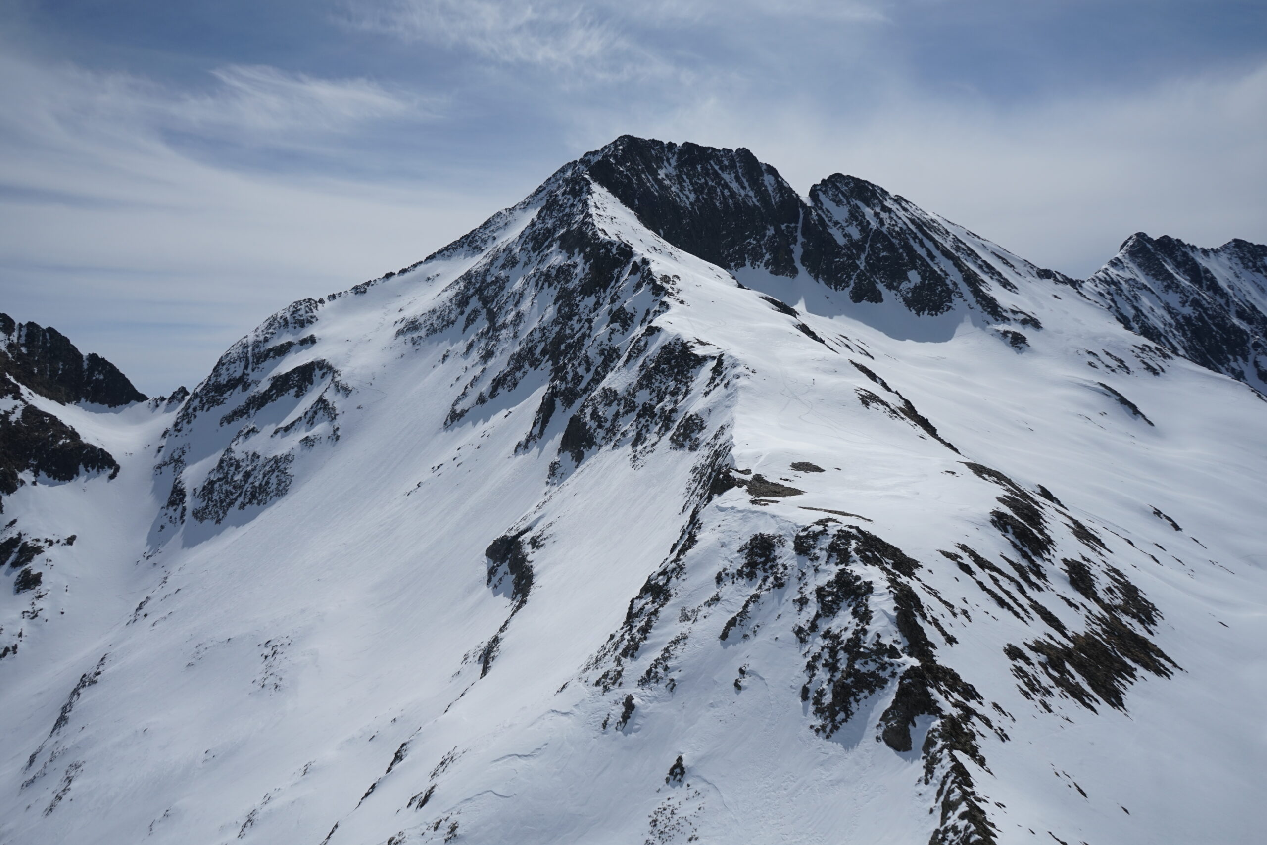 Premier constat : l’enneigement est haut mais nous partirons en basket donc ce n’est pas bien grave. Nous suivons la voie normale du pic de Lustou : d’abord la piste puis le barranco qui avait été dévasté par une avalanche monstrueuse peu avant ma visite en 2014. Nous chaussons les skis vers 1900 m après le brusque changement de direction vers le SE. Laisser l’itinéraire de la cabane de Lustou et poursuivre tout droit dans un goulet en neige dure. Nous nous engageons un court instant dans le goulet suivant avant de le quitter sur notre droite pour des pentes plus larges le long d’une crête intermédiaire. Lorsque le relief s’adoucit, nous traversons l’ensemble de ces pentes suspendues jusqu’au col du Lustou (2649 m) avant lequel nous discutons avec un randonneur en solitaire. le pic de Bocou est alors tout proche : sans perdre d’altitude, rejoindre le collet au pied du sommet et terminer la crête majoritairement déneigée ce jour en posant parfois un peu les mains.