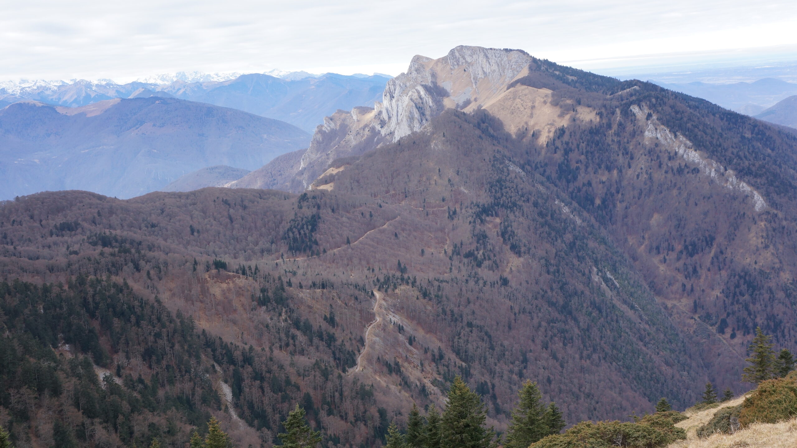 Nous retournons au Pas de l’Âne et descendons hors-sentier vers l’ouest entre pins et pentes herbeuses jusqu’à la piste forestière et la cabane d’Arguenos (1210 m) en contrebas. La piste serpente dans la forêt jusqu’aux abords du col de Caube (1335 m). C’est une portion reposante mais un peu plus terne car elle se situe du côté de la plaine et les sommets sont donc masqués. Du col, le chemin monte dans la forêt puis en sort après une portion plus plane. le pic du Gar avec ses impressionnantes falaises sud et la croix blanche de l’antécime se découvrent alors pleinement. D’ici, il y a deux choix possibles : une sente traverse à flanc en direction de la croix puis monte en lacet sous les barres rocheuses du sommet tandis le chemin balisé en jaune monte directement plein nord et passe sous la crête. Au début, ce dernier est caché à cause de l’herbe, mais il est bien marqué, nous l’avons emprunté à la descente.