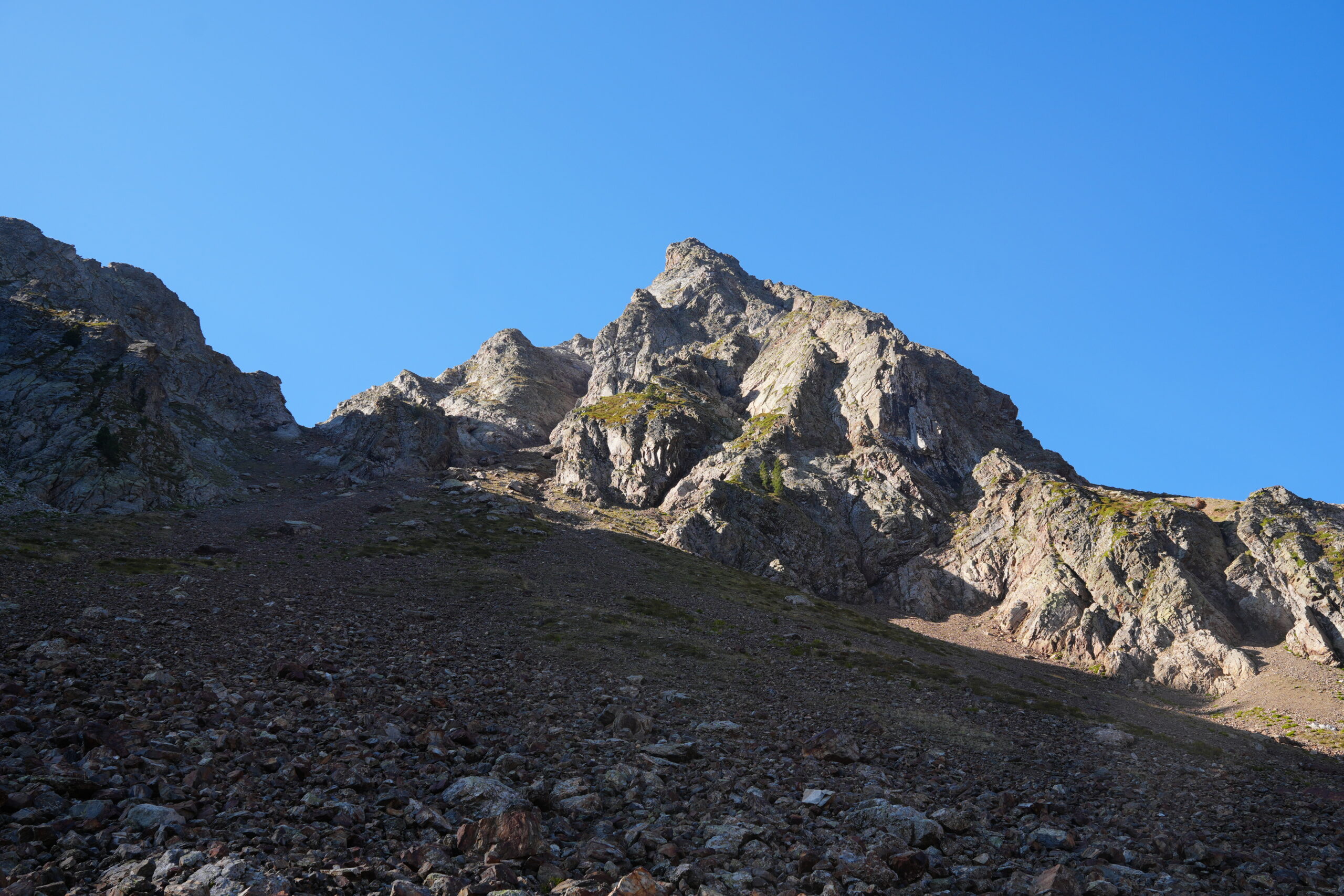 La suite est constamment raide voire très raide jusqu’au sommet tout en ne dépassant pas le II. La première partie pour sortir de la brèche est exposée. Après quelques mètres, il faut tourner franchement à droite dans du terrain mixte. Puis, je rejoins un large couloir où il faut zigzaguer au plus facile, de vire en vire, avec de nombreux petits cailloux au sol mais également du bon rocher qu’il faut privilégier quitte à davantage poser les mains. Plus haut, il semble y avoir plusieurs couloirs possibles et je décide de partir légèrement sur la droite où je rejoins une zone un peu moins raide tout en préférant les zones rocheuses, plus sécurisantes. Le sommet est alors tout proche et s’atteint sans problème. Youpi ! J’érige un petit cairn.