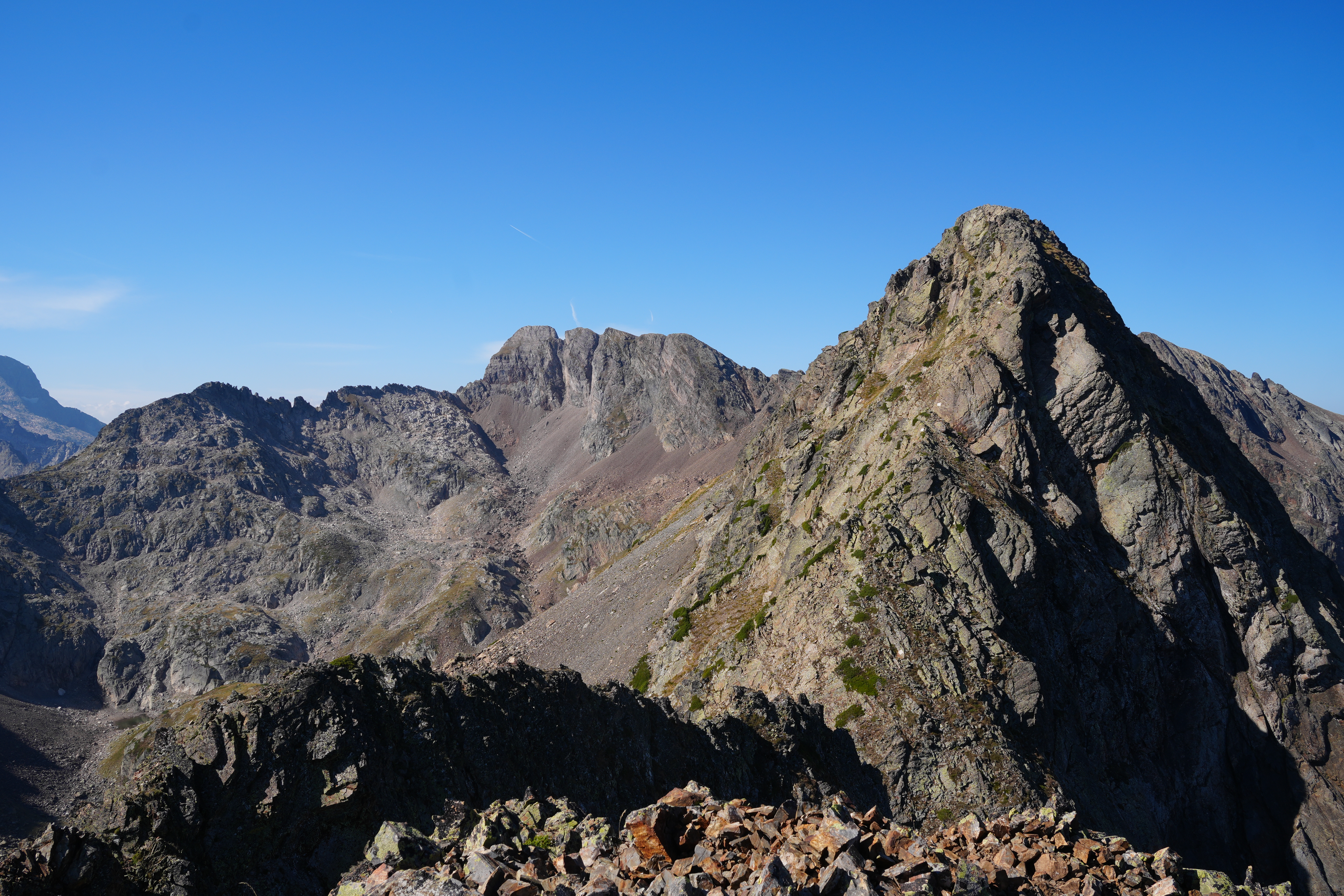Finalement, ce contraste entre la vue de loin et celle sur le terrain m’a fait penser à la face N du tuc de Pébignau qui devient moins effrayante au fur et à mesure que l’on s’en approche. Descente prudente par le même itinéraire avec une grande concentration aux abords de la brèche. Après la descente du court couloir O, le pierrier se dévale facilement. Dans le sens de la montée, ce couloir d’accès à la crête est certes plus court mais il faut parcourir ce pierrier assurément infâme à la montée. De retour sous le pic de Fanlou, je reviens au lac du Tech d’abord par le même itinéraire, puis par la rive gauche. Le bon chemin a d’autant plus de saveur après une tentative réussie comme celle-ci.