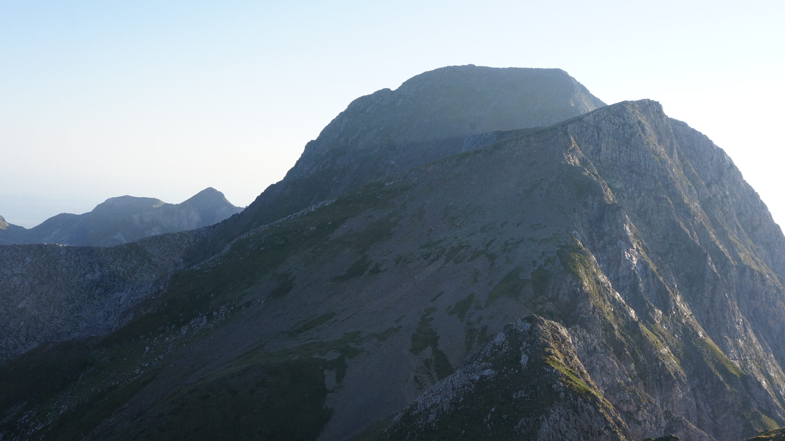Très matinal, j’arrive au port d’Aula (2260 m) alors qu’il ne fait pas encore jour. D’autres personnes sont parties encore plus tôt pour assister au lever du soleil et patientent frigorifiées depuis quelques temps. Couper les lacets permet de gagner un peu de temps et de parcourir une distance raisonnable (4.5-5 km, combien sinon ?) et de monter facilement les 700 mètres de dénivelé. Un long sentier en balcon dont l’érosion demande parfois de l’attention contourne par le sud les Cuns et Montagnoles d’Aula. Après avoir quitté le sentier et délogé des isards qui n’en demandaient pas tant pour monter vers la frontière et profiter d’une vue dégagée vers le N-NE pour le lever du soleil, je retrouve le sentier et poursuis ma route vers le col de la pale de la Clauère (2522 m). Pendant la montée, je remarque deux silhouettes sombres nichées au loin sous le pic de la pale de la Clauère. N’ayant pas de paire de jumelles, j’ose les plus folles spéculations : serait-ce deux ours ? Le secteur est réputé pour en accueillir…