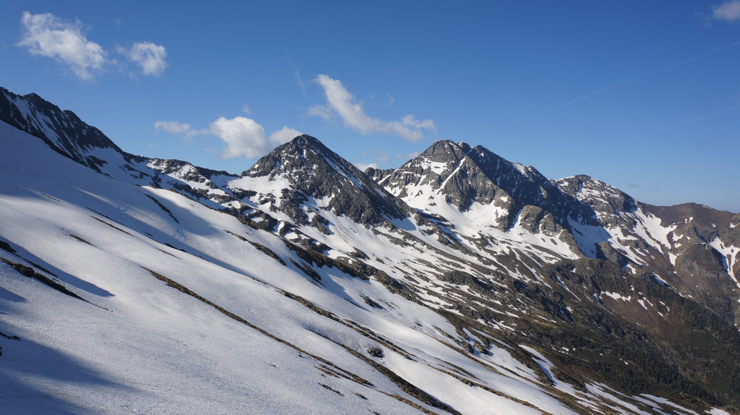 Après la cascade, le chemin est de plus en plus épargné puis l’est totalement après avoir traversé le ruisseau de la Piarre. Je rejoins ensuite la jolie cabane de Lustou (malheureusement fermée), posée en haut d’un escarpement rocheux. Puis, le long de la Montagne de Bacou, les premières langues de neige font peu à peu leur apparition et permettent de gagner rapidement la base du pic de Lustou dont les crêtes découpent l’horizon. Il existe plusieurs variantes pour rejoindre l’arête : je choisis la plus évidente qui est d’ailleurs déjà tracée et rejoins l’arête au point 2700 environ.