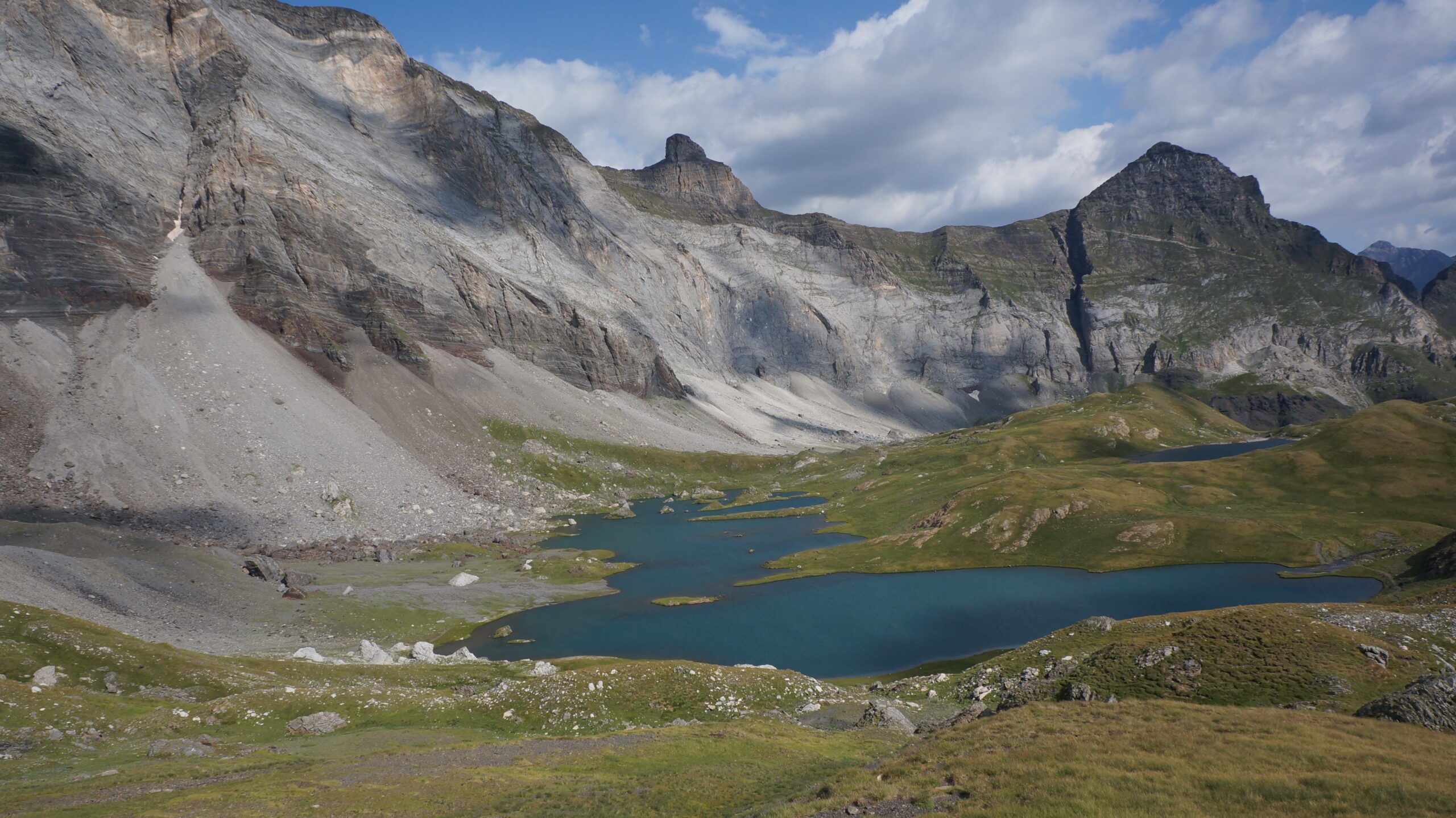 Du lacet marquant le début de la vallée, le large chemin se transforme progressivement en chemin qui mène à la cabane de Géla située sur un grand replat. Les contreforts de la muraille de Barroude commencent à apparaître. Le chemin s’élève tranquillement jusqu’au pied de la muraille sous le pic de Gerbats puis jusqu’aux lacs de Barroude (2369 m environ) : endroit merveilleux et tranquille où les sifflements des marmottes résonnent contre les parois calcaires. La météo n’est pas excellente et un voile épais s’amoncelle.