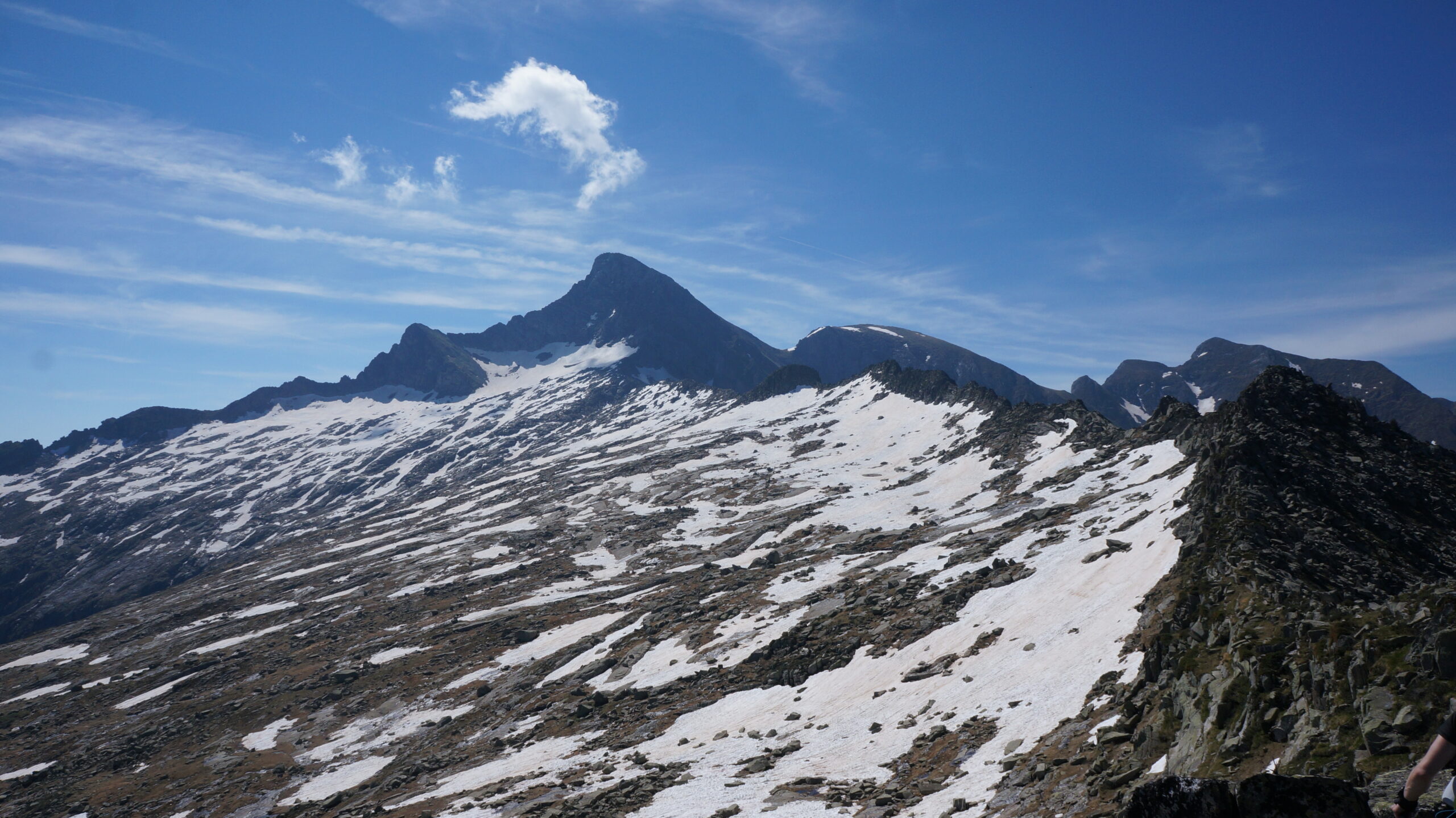 Pour monter au pic de Trémul, il semble possible dès la porte de monter une petite cheminée rocheuse qui aboutit sur la crête menant au sommet. De notre côté, nous sommes descendu côté E avant de remonter une petite cheminée (II) jusqu’à la crête. Cette dernière nécessite de poser un peu les mains (II max.) jusqu’au sommet (2350 m). Le sommet n’est pas le point culminant de la crête puisqu’une pointe toute proche semble légèrement plus haute. Nous poursuivons sur cette crête amusante en très bon rocher (II max.), peu ou pas aérienne, et jalonnée de nombreux échappatoires permettant de descendre sur les Lauzets afin de continuer tranquillement. Nous suivons la crête avant d’en descendre à mi-chemin du cap de Pouech pour profiter aussi de la neige. La montée au cap de Pouech (2483 m) côté E semble plus raide et soutenue que le reste de la crête de Trémul alors qu’on y accède facilement à partir du col de Pécouch (2462 m) à partir duquel nous faisons l’aller-retour.