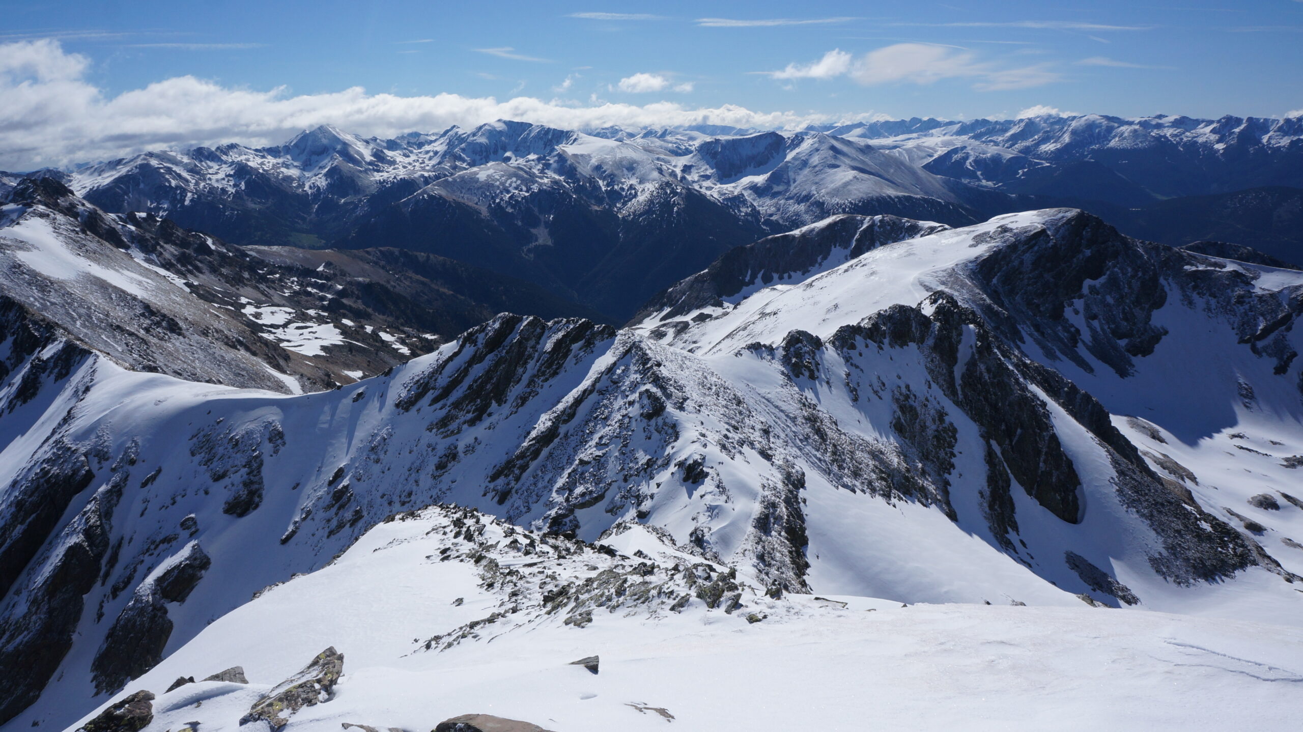 Nous laissons sur la gauche l’élégant couloir NO puis remontons facilement le vallon jusqu’à 2400 m environ où le couloir O se révèle enfin. Il y a deux couloirs similaires : c’est celui du gauche, bien identifiable, il est un peu plus encaissé le long d’un contrefort. Nous mettons les crampons à l’entrée du couloir après avoir remonté le cône de déjection. La neige est portante et nous nous enfonçons juste ce qu’il faut. Pierre fait une bonne trace (quoiqu’un peu grande pour Lucille) jusqu’à la sortie. À l’ombre pendant toute la montée, nous profitons enfin d’un bain de soleil revigorant. Panorama intéressant sur tous les sommets de la Haute-Ariège.