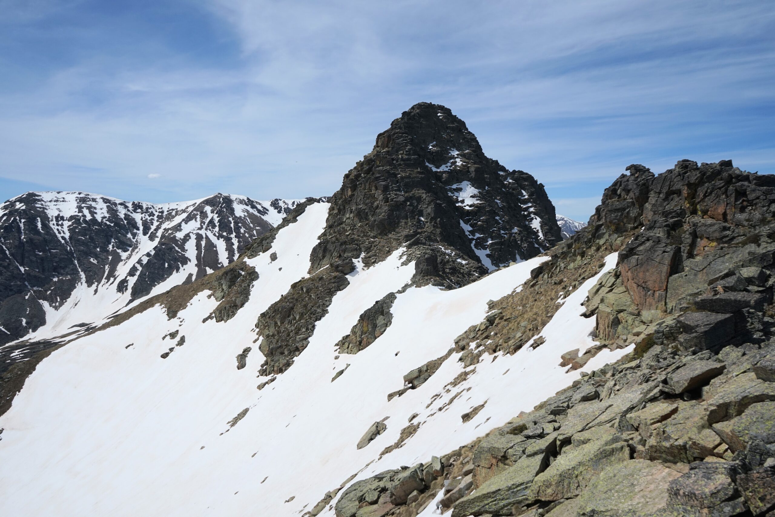 Du pla de las Peyres, montée magnifique à la collada de Juclar (2442 m) en passant par l’Estagnol (2122 m) et l’étang de Joclar (2377), joliment niché au milieu des sommets du secteur. Puis, sur quelques névés bienvenus et au prix d’un bref crochet en Andorre, nous rejoignons le col de l’Albe (2539 m). L’étang de l’Albe est encore bien gelé. Nous prenons la direction du S pour le pic d’Escobes : le cheminement est bien cairné. Il semble d’ailleurs y avoir plusieurs itinéraires cairnés. Déneigé, pas de problème à condition de prendre garde aux chutes de pierres si vous êtes en groupe. Enneigé, ça ne doit pas être la même histoire car les pentes sont raides. Après avoir rejoint la crête, la dernière portion apparaît enfin. Nous cherchons à éviter quelques névés résiduels dans des passages plus laborieux que difficiles. Toujours cairné, le cheminement amène ensuite rapidement au sommet avec un pas II pour rejoindre un mini dièdre débouchant proche de la cime. Très beau panorama. Pour une première dans le secteur, Laura et Robin sont gâtés.