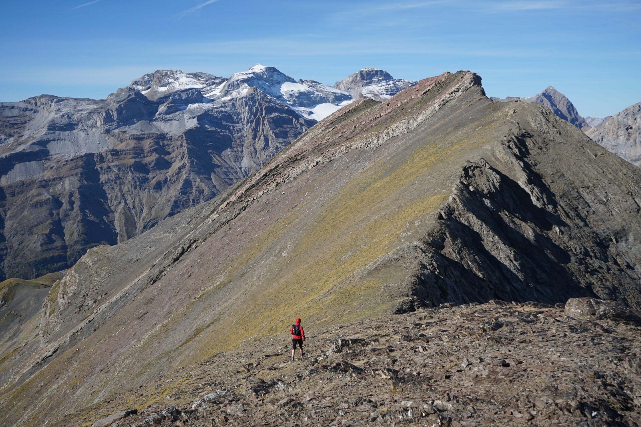 Lorsque la pente est moins prononcée, atteindre les lacs de la Munia demande encore quelques efforts. Dans ce joli vallon suspendu (barranco de la Larri), la pène Blanque de Troumouse aimante le regard. Cette paroi calcaire contraste avec les sommets voisins. Le chemin est bien marqué et mène facilement aux abords des superbes lacs de la Munia lovés entre les falaises austères de la Munia et de la Robiñera. Nous sommes repassés à l’ombre et le vent est glacial. Dans la pierraille, nous rejoignons la crête N de la punta de las Puertas. Rapidement, un court mur en III (bon rocher) fait obstacle. Mieux vaut ne pas partir trop à gauche pour limiter l’exposition. Heureusement qu’il est court car j’ai les mains gelés et c’est avec plaisir que nous retrouvons le soleil pour la suite de la crête. Passage à la punta de las Puertas puis au pico del Chinipro, tout proche. Vue sublime sur le massif du mont Perdu. Le Vignemale est visible aussi, tout comme Cotiella, Suelza, Posets ou encore Schrader. Le sommet est étonnant avec un mélange de rochers colorés.