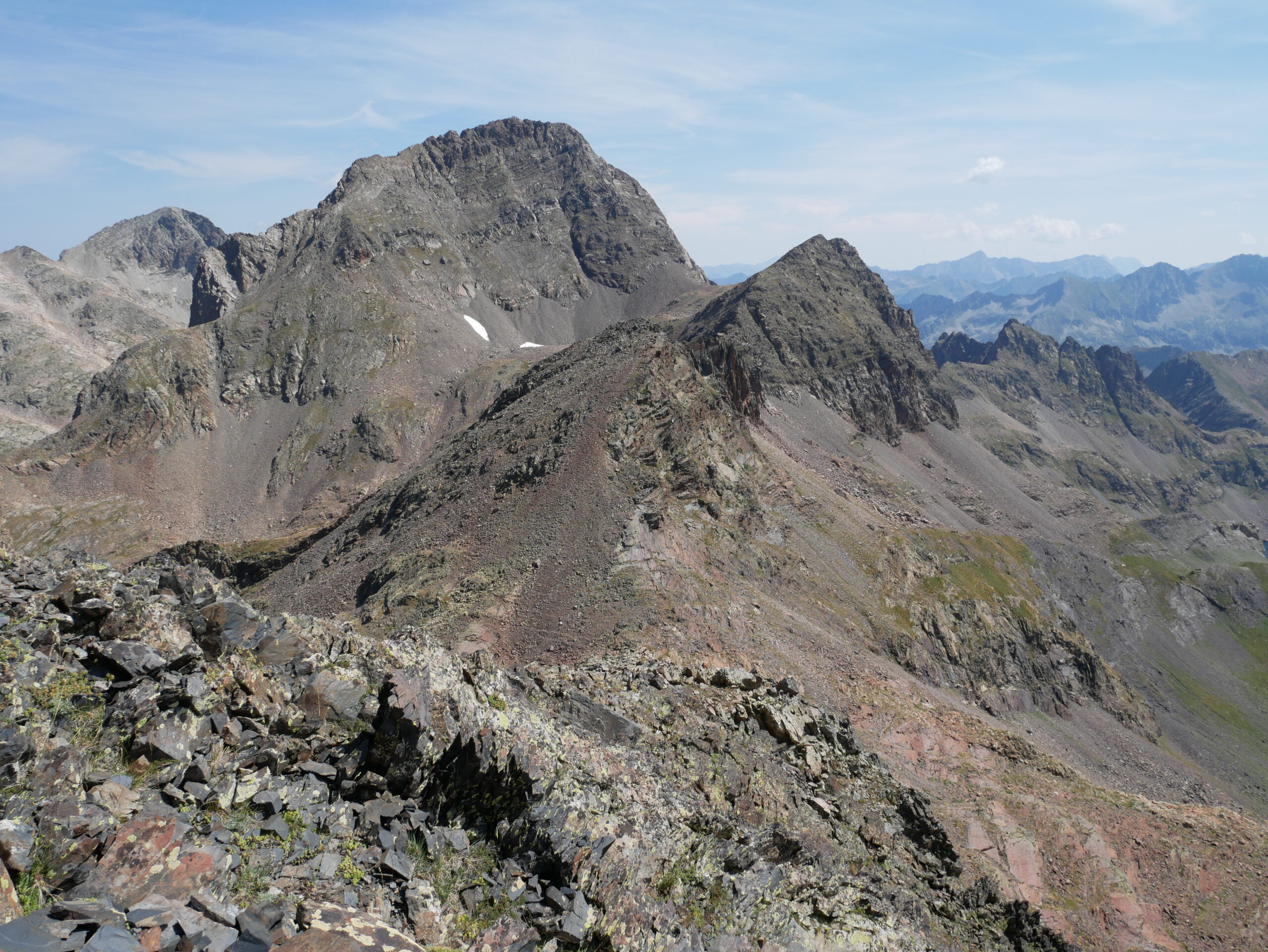 Les puntas de Pecico (Norte, Central et Sur) ainsi que le pico de los Ibónes de Pecico ont probablement fait récemment leur apparition sur la carte IGN espagnole. Pour visiter la punta de Pecico Norte, repérer une brèche entre cette dernière et la grande Fache, toujours aussi élégante. Nous remarquons qu’une bonne trace monte raidement jusque dans le pierrier sous la brèche, et que plusieurs personnes l’empruntent. Je ne pensais pas qu’il y aurait autant de monde sur cette voie d’accès à la grande Fache. La brèche est défendue par un court couloir rocheux nécessitant de poser les mains. La punta de Pecico Norte est alors toute proche. Les voix des espagnols sur l’arête S de la grande Fache résonnent jusqu’à nous. Il n’est pas possible d’emprunter intégralement (et raisonnablement) la crête jusqu’à la punta de Pecico Central car elle présente une section très découpée. Nous basculons versant N pour traverser un petit cirque et remonter facilement vers la punta de Pecico Central puis continuer facilement jusqu’à la punta de Pecico Sur, à la cime bicéphale en mauvais rocher. La vue sur la punta Zarra, si sévère, est privilégiée. De retour à la forqueta de Bachimaña (2781 m), aux étonnants rochers rosés, nous descendons vers les étangs de Pecico où une bonne sente fait son apparition.