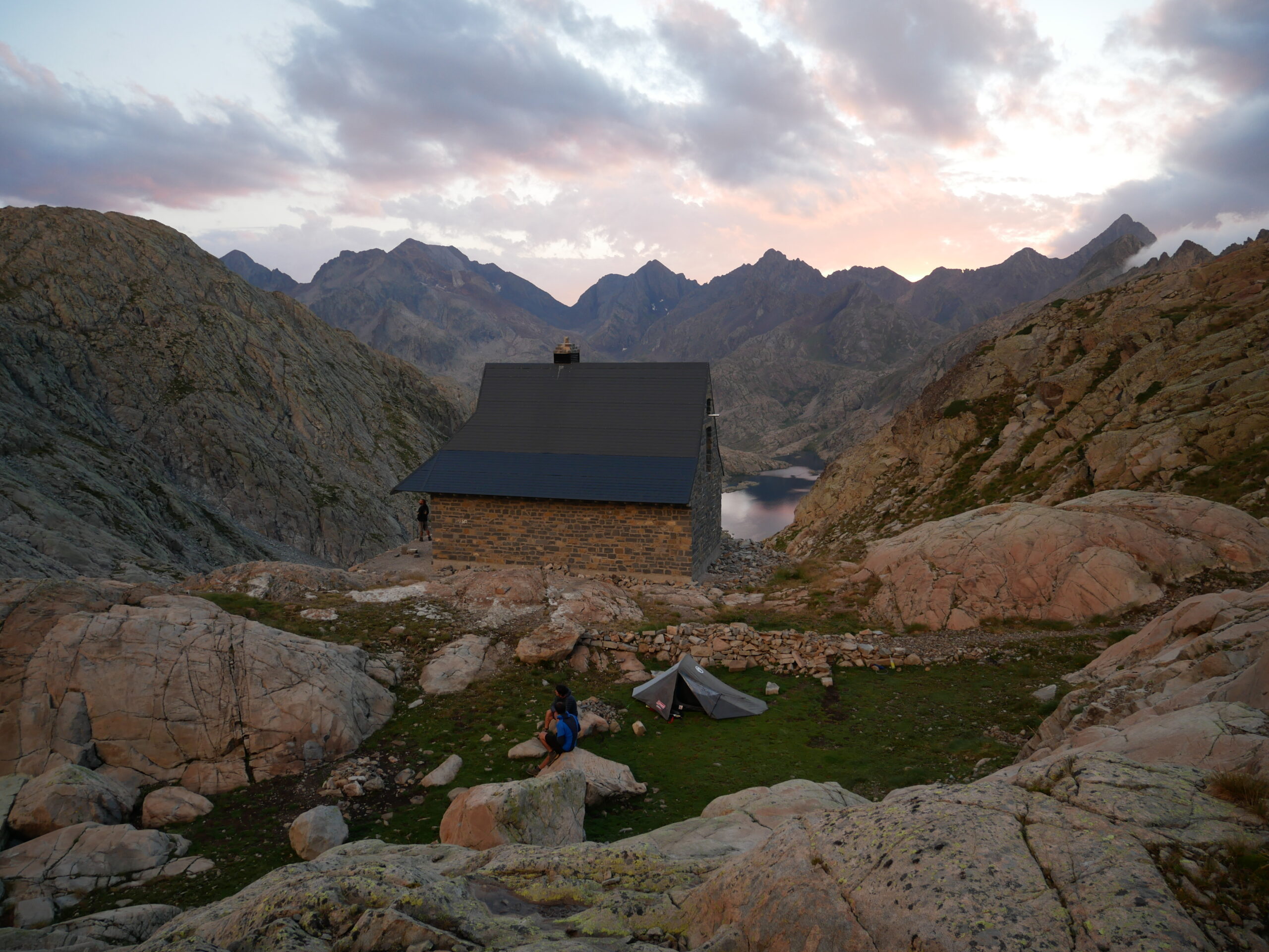 Le refuge est bien placé au déversoir de l’ibón de Bramatuero Alto. Construit en 2018, il ne faut pas se fier à la taille du bâtiment car seule une petite partie est destinée aux randonneurs. Il n’y a aucun équipement à l’intérieur et il faut faire attention aux barreaux descellés pour monter à l’étage qui peut accueillir 4 personnes. La nuit, toutes les 20 minutes environ, un moteur assez bruyant se met en marche durant 2 minutes. Néanmoins, il n’est pas trop dérangeant avec les boules-quiès. Nous passons la soirée avec un couple d’allemands et un homme seul en itinérance ainsi que le couple d’amis croisé le matin, en montagne pour deux jour également. Moments sympas devant le refuge en pronostiquant sur la venue ou non des orages qui grondent autour. Finalement, quelques gouttes tomberont en soirée avant que le soleil s’impose à nouveau pour un joli arc-en-ciel et un beau coucher de soleil sur l’ibón de Bramatuero Bajo. Vers 1h30 du matin, alors que je n’arrive pas à fermer l’oeil de la nuit même si j’ai tout pour dormir confortablement, une averse violente s’abat sur le secteur. Quelques instants plus tard, la porte grince et le couple de français se rapatrie en urgence car la tente flotte une flaque et une partie des affaires est trempée. Fou rire avec Lucille en attendant les conversations et en imaginant le chaos humide en pleine nuit. En tout cas, ce n’est pas cet évènement qui nous aide à bien dormir mais le jour finit enfin par arriver et nous nous levons à 6h45.