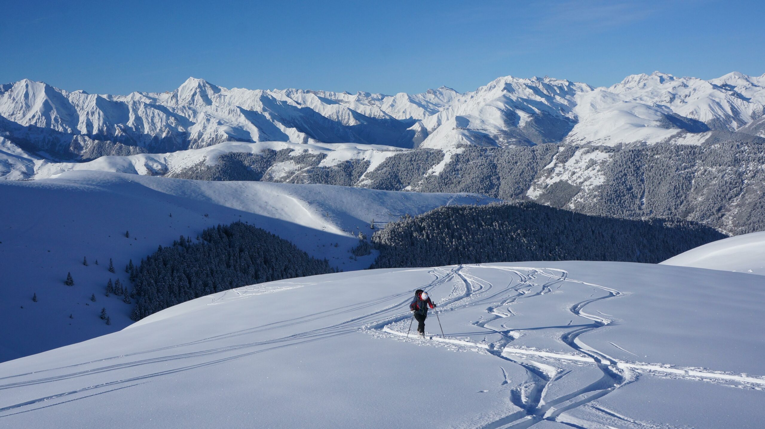 Depuis le parking situé au dessus du village, suivre la piste qui contourne le hangar agricole. C’est appréciable de chausser dès le parking où 30 centimètres sont tombés quelques jours plus tôt. La piste (nommée sur la carte IGN « Route forestière de Balencous ») monte tranquillement en passant au-dessus du village avant de pénétrer au milieu d’immenses sapins bien chargés de neige. Les paysages sont féeriques ! Elle vire du nord à l’est et nous quittons progressivement la forêt jusqu’à une première cabane (1565 m). On devine rapidement que le secteur regorge de possibilités tant les croupes, cols et autres combes sont nombreux. Malgré le temps maussade de la veille, quelques irrésistibles sont déjà venus et ont partiellement tracé la zone. Heureusement, car la neige est profonde et nous aurions bien plus souffert. Nous poursuivons au fond du vallon jusqu’à une seconde cabane (1757 m). Juste après cette dernière, partir vers le NE jusqu’au col du Louron (2001 m). Le sommet débonnaire de Pouy-Louby est alors tout proche. Grand soleil, températures douces, pas un souffle de vent, c’est parfait. Sur une neige superbe, nous descendons par le même itinéraire jusqu’à la cabane (1757 m).