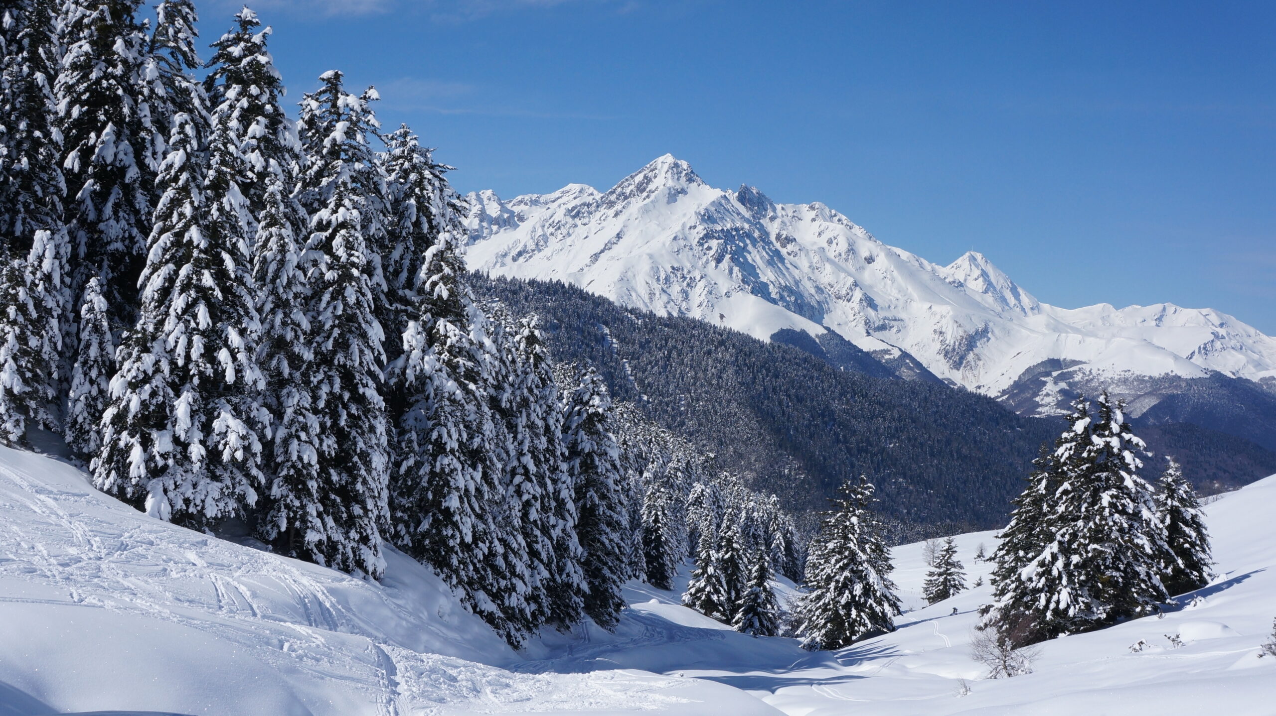 Depuis le parking situé au dessus du village, suivre la piste qui contourne le hangar agricole. La piste (nommée sur la carte IGN « Route forestière de Balencous ») monte tranquillement en passant au-dessus du village avant de pénétrer au milieu de grands sapins. Il a fait froid ces derniers jours et, pour notre plus grand plaisir, les sapins sont encore une fois chargées de neige. La piste vire du nord à l’est et nous quittons progressivement la forêt jusqu’à une première cabane (1565 m) sous une tempête de ciel bleu. Alors que la montée au sommet de Jambet était tracée, celle du sommet du Tech est vierge. Juste après la cabane, monter vers le NE au plus facile jusqu’à rejoindre la large crête débonnaire qui mène au sommet. La trace est assez fatigante avec une neige croutée sur le bas puis une neige poudreuse compacte sur le haut. Trois skieurs nous ont suivi de loin et repartent un peu avant le sommet. Panorama étendu toujours aussi appréciable. La vue est très belle aussi sur le vallon du lac de Bareilles où la neige a joliment lissé reliefs et contrepentes.