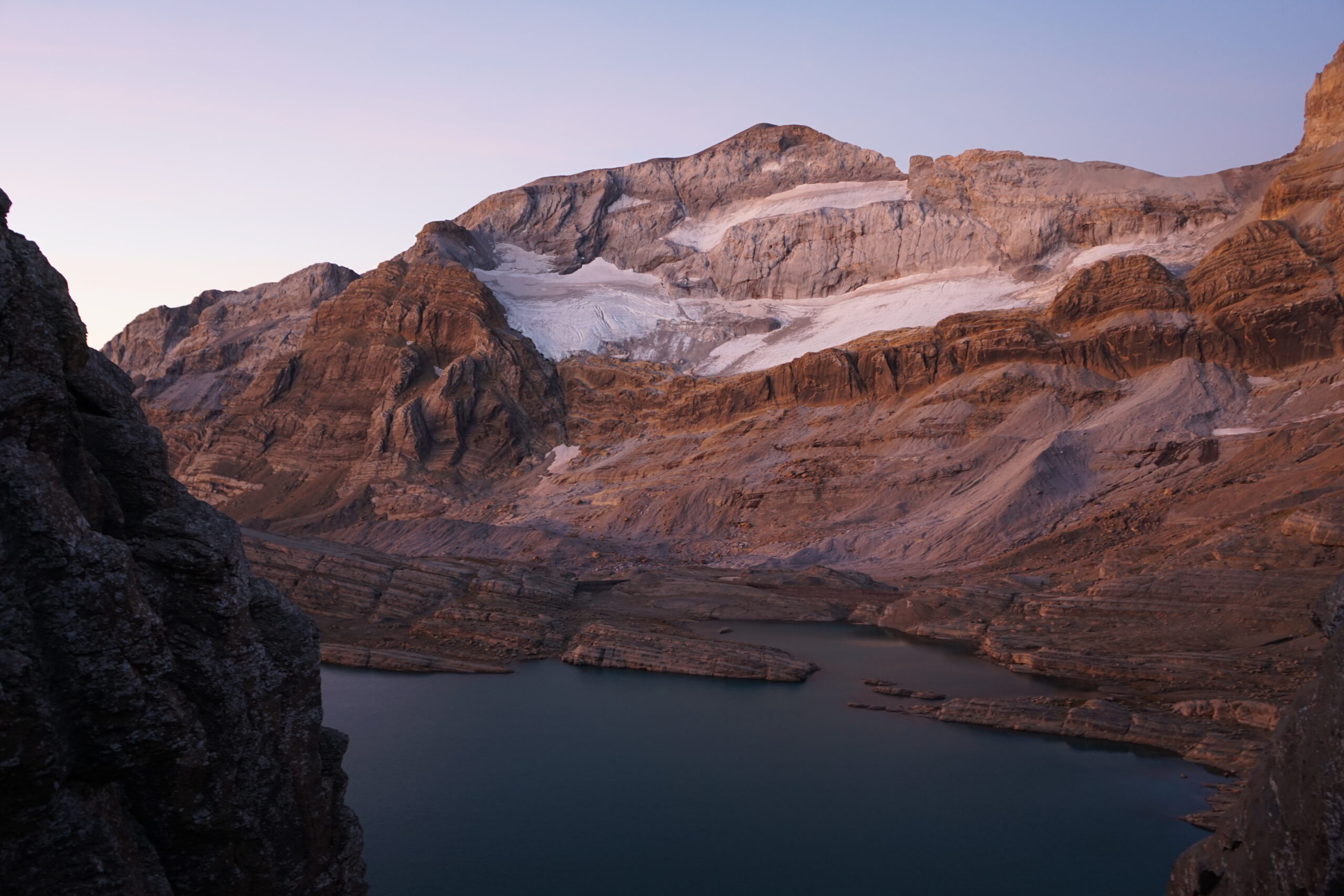 Le lendemain matin à 4h30, le ciel est étoilé et le soleil sera au rendez-vous. Au sortir du couloir de Tuquerouye, ses premiers rayons viendront lécher la face nord crevassée du mont Perdu et réchauffer le lac Glacé quelques dizaines de mètres sous nos pieds. Ils iriseront les embruns des cascades successives du Marboré. Puis, plus haut dans le ciel, il soulignera clochetons, contreforts et sinuosités des remparts de Pineta. Il écrasera ensuite les canyons d’Añisclo et d’Ordesa, nous assèchera la gorge dans la zone lunaire après le refuge de Goriz puis nous laissera tranquille à l’abri sur les vires vertigineuses des murailles d’Ordesa. Au pic Mondarruego, il illuminera l’envers du cirque et nous réconfortera de la fraîche brise automnale. Enfin, lorsque le voyage se terminera dans le lourd silence de l’amphithéâtre de Gavarnie, seulement dérangé par le fracas de la grande cascade et les cris des choucas, l’ombre grignotera les miradors du cirque puis finira par nous engloutir aussi. En une journée, 2 jours, 4 jours ou une semaine, peu importe, allez faire le tour du mont Perdu, courez-y, foncez-y… Il y aurait tant à dire, voici donc l’histoire condensée de 4 andouilles sur les vires (référence pour amateurs de charcuterie) du mont Perdu.