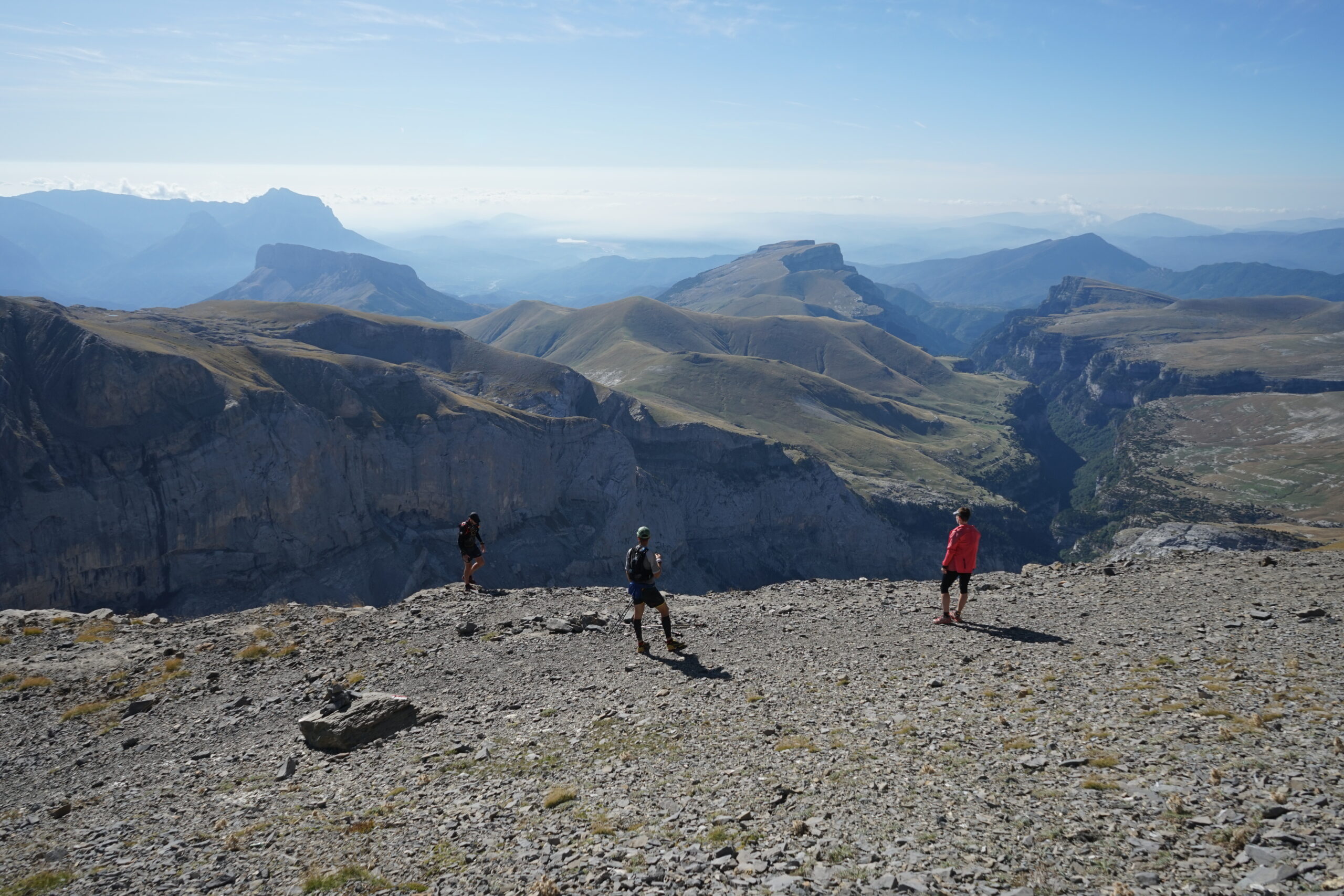 Même si l’itinéraire est balisé, on se demande jusqu’au dernier moment quel sera le passage. Une désescalade équipée nous dépose sur une large plateforme quasiment horizontale qui enroule les versants Est et Sud au-dessus des falaises. Au détour d’un promontoire (2800 m environ), c’est une nouvelle claque : du collado de Añisclo où nous étions juste avant, jusqu’à ce qu’elle s’évanouisse des kilomètres plus loin, la faille du canyon d’Añisclo est visible dans son intégralité. Tandis que la vire se fond dans le versant sud de la Punta de las Olas, nous quittons progressivement la verticalité pour parcourir de voluptueux reliefs jusqu’au refuge de Goriz (2150 m). Nous courons un peu afin de tenir l’horaire et de nous dégager du temps pour une pause méritée au refuge. Pique-nique, ravitaillement en eau (assez rare sur le parcours), provisions, point sur la suite du programme, nous sommes à la moitié de l’itinéraire et c’est le moment de récupérer même si tout le monde se porte très bien.