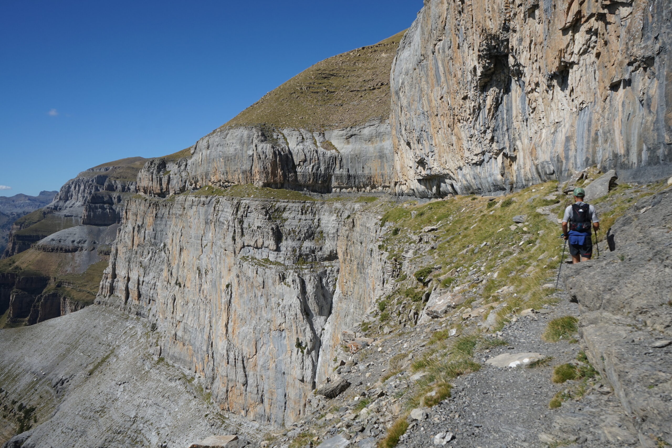 Si l’arrivée à Goriz était plutôt herbeuse et un paradis pour les marmottes, la partie suivante est beaucoup plus aride. Géologiquement, le secteur est très tourmenté : de larges plateaux aux pieds de dômes étonnants lacérés par des strates régulières, le Taillon aux couleurs évoquant plutôt un Malabar bi-goût qu’une montagne et les pentes chaotiques menant à la brèche de Roland. Cette dernière, porte de retour vers Gavarnie, est d’ailleurs toute proche mais nous partons dans la direction opposée : Faja de las Flores, depuis le temps que j’entends parler de toi, nous voici ! Après un nouveau plateau intrigant, l’entrée de la vire est défendue par une zone de lapiaz. Je présume que nous n’avons pas pris l’itinéraire le plus stratégique mais naviguer entre ces failles, trous et dolines fut proche d’être démoralisant. Heureusement, la récompense ne tarde pas à arriver avec le Morrón de Tobacor, mastodonte du canyon d’Ordesa qui se dévoile de haut en bas à l’entrée de la vire. J’ignore si le responsable est ce même Roland qui, selon la légende, forma la brèche d’un coup d’épée mais tel un coup précis de couteau dans ces parois vertigineuses, la vire des fleurs file quasiment à plat pendant 3,5 km : un p****n de chemin dans un p****n de décor. Magique. À certains endroits, la glissade est interdite surtout que le wingsuit est resté au placard et ce n’est certainement pas mon coupe-vent trop grand qui fera l’affaire.