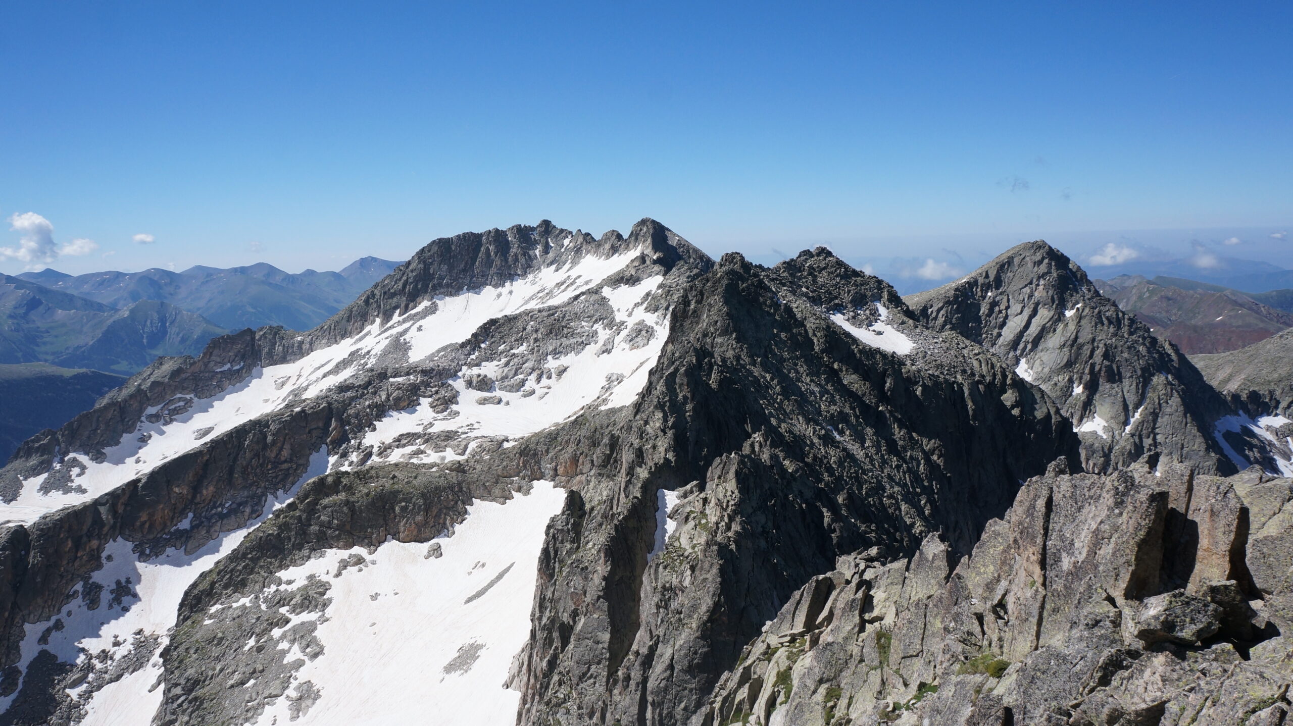Nous le contournons par la droite pour monter dans une raide ravine mi-gispet mi-éboulis (cairns) dans l’axe de la brèche Peyta (2760 m). Bien avant d’atteindre celle-ci, nous traversons éboulis et névés pour prendre pied à la base du Besiberri Nord désormais bien visible. La cotation PD+ de la petite face rocheuse du BN est justifiée. Plusieurs cheminements sont possibles : ce n’est normalement jamais difficile en suivant les cairns mais parfois exposée. Nous concernant, nous sommes passés notamment dans un petit dièdre où il y avait un piton. Au sommet, panorama fantastique et aperçu du long morceau de crête qui nous attend et que nous ne tardons pas à entamer.