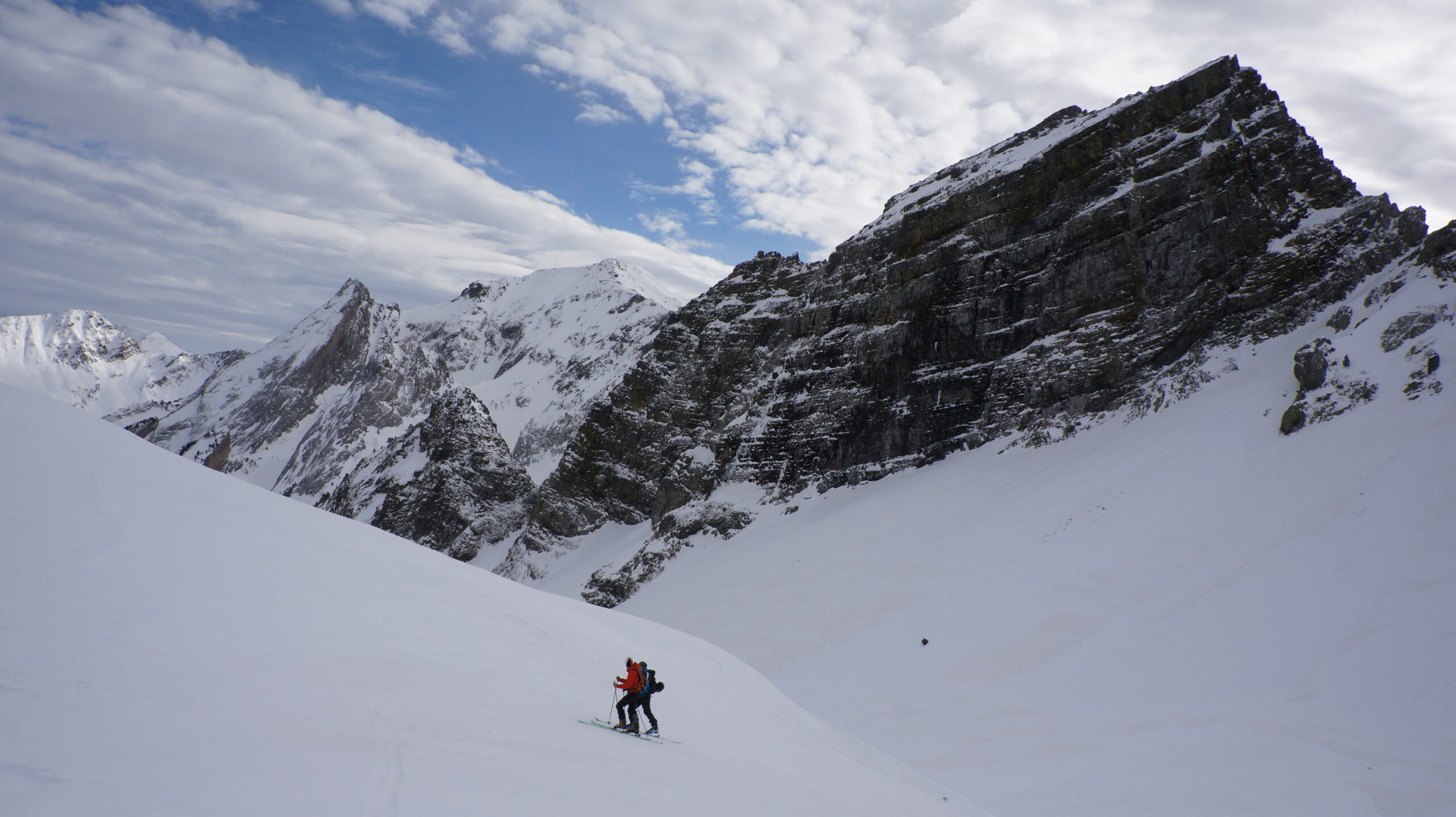 Monter vers l’ouest au plus facile en laissant les traces rejoignant le vallon du port de Vielha. Nous passons une succession de bosses et mamelons avant que le col n’apparaisse enfin. Pierre et Gaël sont passés la veille mais le vent a déjà nettoyé leur trace qui est à peine visible par intermittence. Après une courte descente, nous sommes au pied du col défendu par une pente un peu plus raide où Fabien n’a aucun mal pour ses premières conversions. Au col (2327 m), le vent redouble d’intensité (80/90 km/h). La crête n’étant pas large, pas assez pour moi en tout cas, je laisse les skis et monte à pied au sommet sous de grosses rafales qui font voler des morceaux de corniche. Nous restons seulement 2 minutes au sommet, le temps de constater que le panorama n’est pas dénué d’intérêt. Bien visible, la Forcanada est décidément un hardi sommet qu’importe l’endroit d’où on la regarde. De l’autre côté, la crête des Besiberri donne moins envie dans ces conditions.