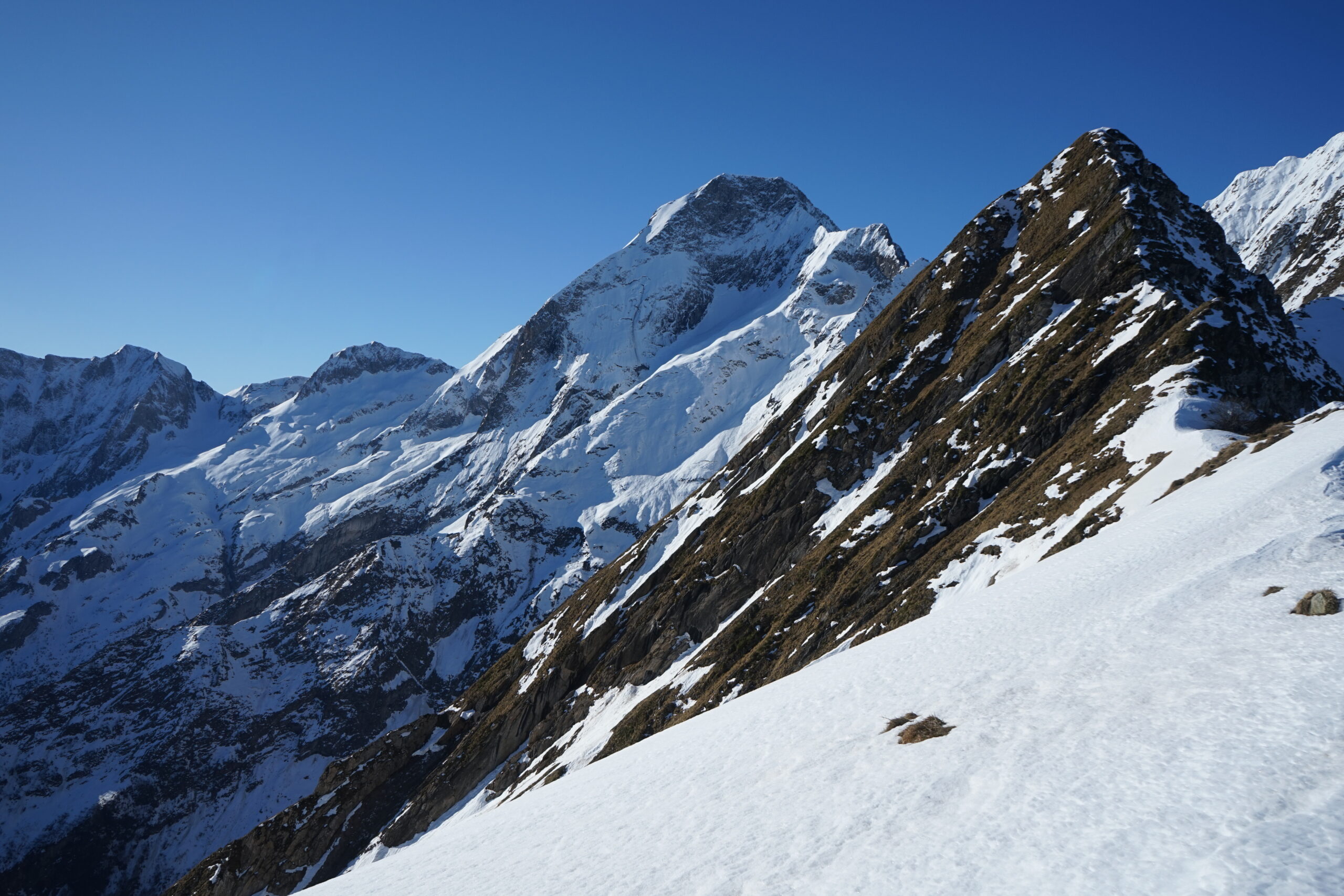 La montée au tuc de Rase Cournard est raide mais facile. Un isard nous nargue puis nous évitons quelques plaques de neige et pouvons découvrir au sommet le mont Valier qui se montre timidement. Nous nous approchons tranquillement du dernier ressaut défendant le pic de Lasirouge. Malheureusement, un passage est rendu délicat à cause de la neige : très étroit, avec deux couloirs abrupts plongeant de part et d’autre. Nous décidons sagement de faire demi-tour et revenons au pic des Clots.