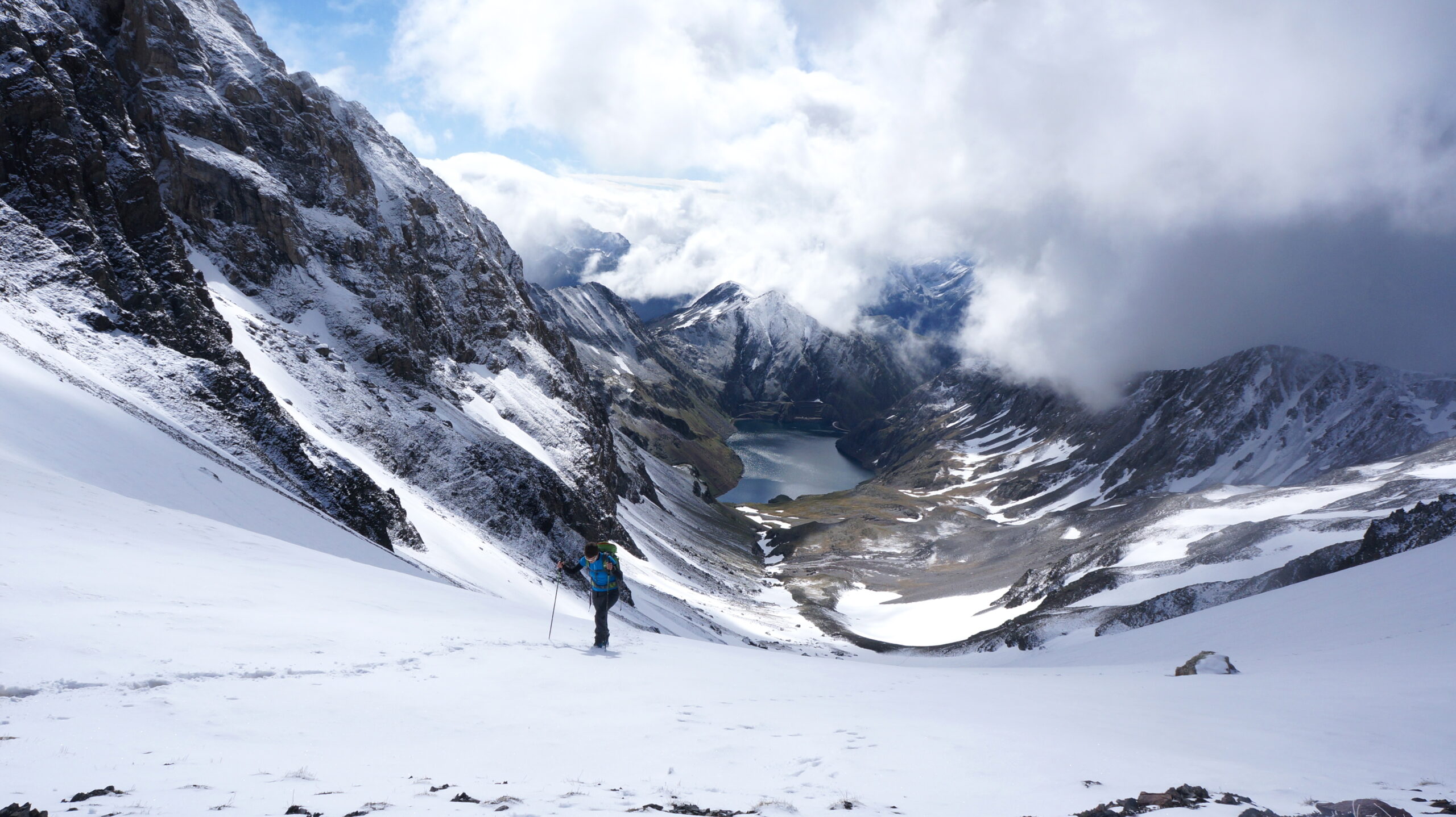 Nous contournons le lac par la droite sur le GR11. Après ce dernier, nous laissons le GR11 et l’itinéraire du refuge de Llauset sur notre droite pour poursuivre vers l’ouest en direction du collado de Llauset (2835 m). Les dernières pentes sont défendues par un névé dur recouvert d’une pellicule de neige fraîche. Depuis le départ, un chien joueur nous suit et nous ne parvenons pas à nous en débarrasser. Si l’itinéraire doit être évident lorsque tout est sec, nous prenons notre temps sur des portions devenues délicates avec la neige fraîche.