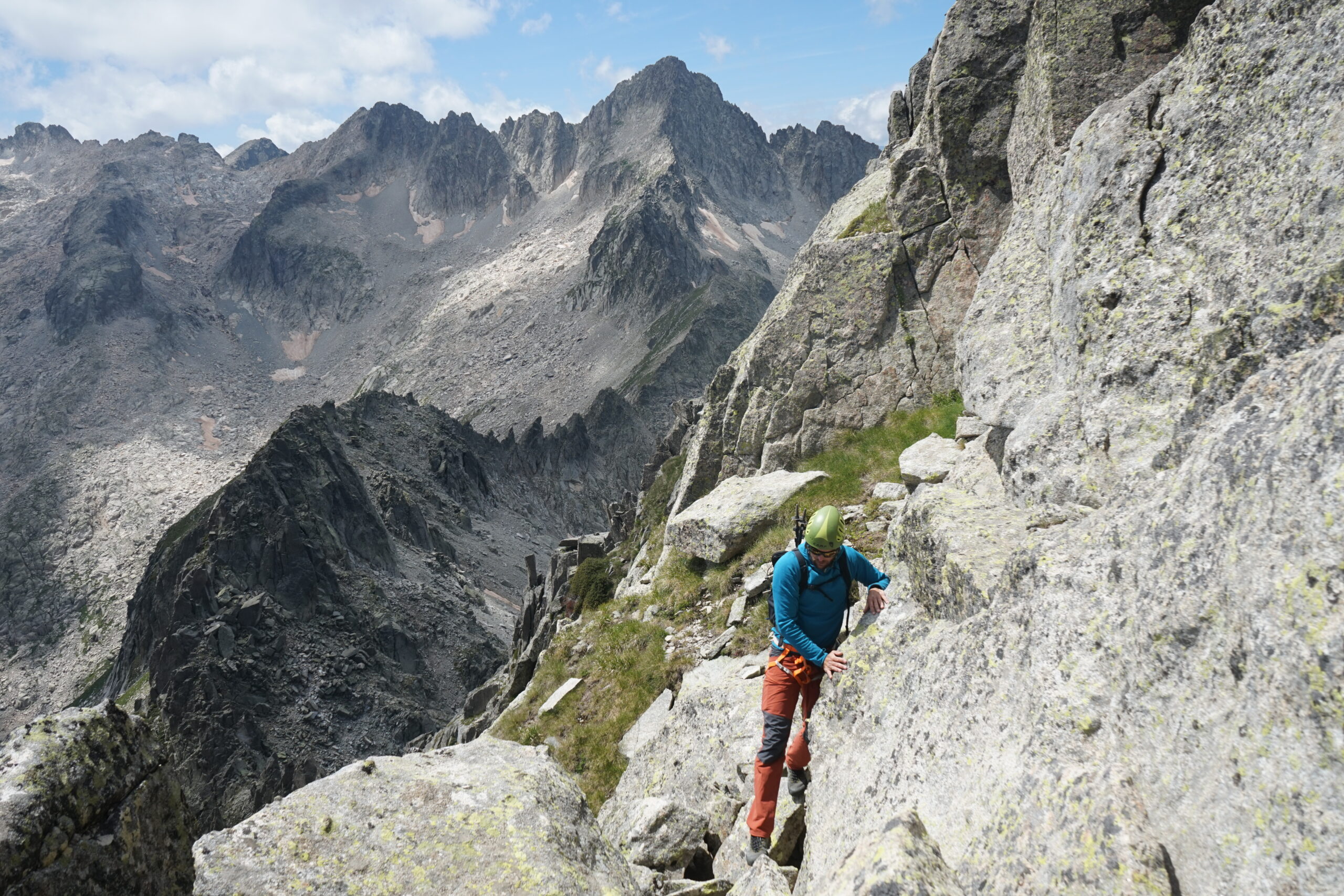 Nous revenons par le même itinéraire et repassons versant N pour aller à la brèche que nous avions presque atteinte précédemment. Nous franchissons cette brèche pour arriver au milieu de crêtes découpées et flèches imposantes. La vue sur le Besiberri N est somptueuse. Une corniche herbeuse permet de passer à nouveau versant S pour descendre jusqu’au coll d’Harlé. Cette descente mérite de l’attention avec beaucoup de désescalade et un peu de lecture pour savoir aller au plus facile. Trois personnes nous devancent dans la montée à la Punta d’Harlé. Nous longeons la crête dans du terrain varié où il faut souvent poser les mains avant d’atteindre la pente sommitale plus franche et continue. Nous la remontons avant de rejoindre l’antécime par une cheminée en bon rocher. Les trois personnes sont ici et n’ont pas souhaiter continuer. Ici, les blocs se font plus grands, certains sont même immenses. Même si la progression reste facile, l’atmosphère y est plus impressionnante. Nous arrivons à l’antécime et comprenons pourquoi ils ont fait demi-tour : le vrai sommet n’est pas tout proche ! Une crête esthétique (quelques pas de III selon le cheminement mais peu exposés) flanquée de belles flèches nous amène à la Punta d’Harlé qui est aussi un magnifique belvédère.